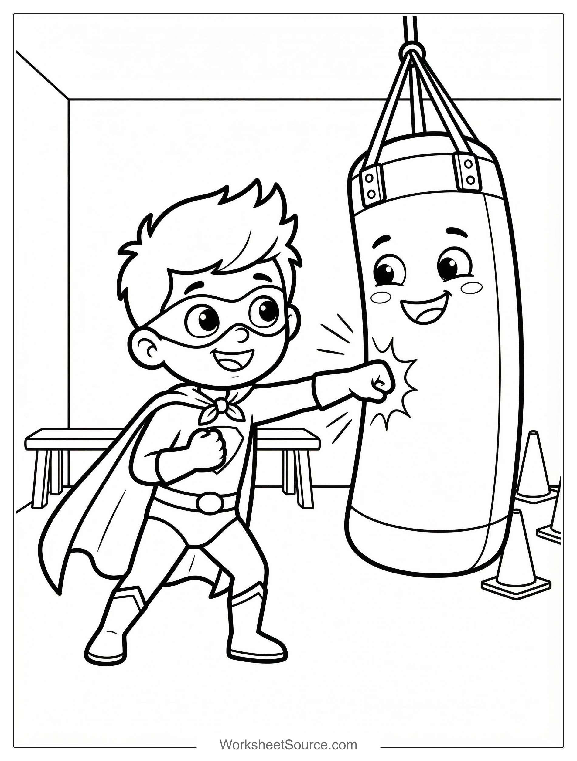 What a fun Superhero Training Scene coloring page to bring to life. The picture shows a brave hero practicing punches on a friendly punching bag, and that simple setup sparks lots of imaginative play. Notice the cape, mask, and emblem; those are great spots to practice bold color choices and patterns. In class, you could make a Superhero Training Center where each child colors a different role and then shares a short heroic story, or tape finished pages to a bulletin board to build a comic strip wall. At home, this printable is a cheerful rainy day activity. Set a timer for focused coloring and then have a family story time about what powers each hero might have. For a creative extension, encourage kids to design their own emblem on a separate sheet and glue it to the picture, or write a sentence about a training goal and staple it to the bottom. This printable is free and easy to copy, and it invites movement, imagination, and teamwork while kids color and create.