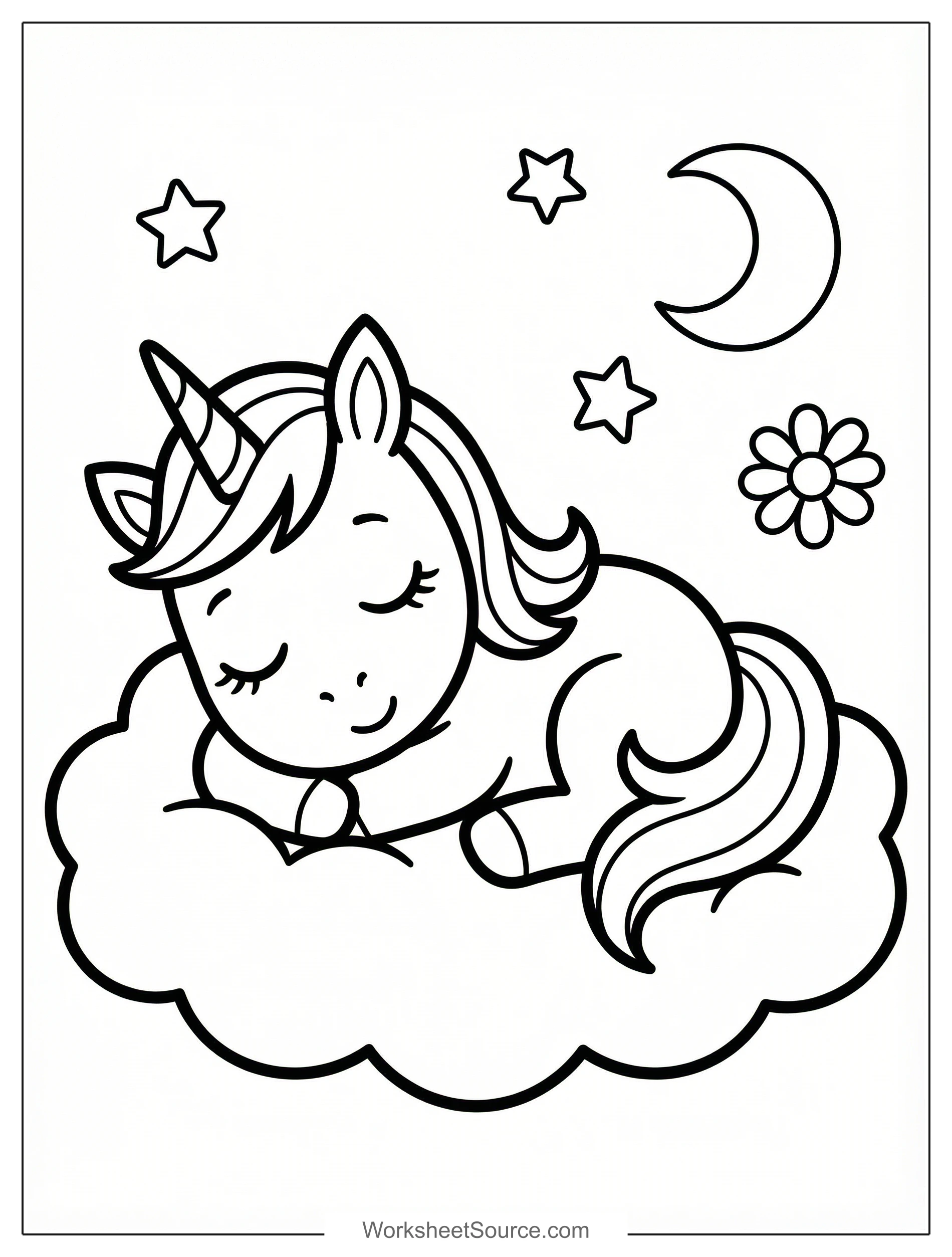 Download this free printable Baby Unicorn Sleeping coloring page for kids. Great for classroom activities, home learning, and creative fun.