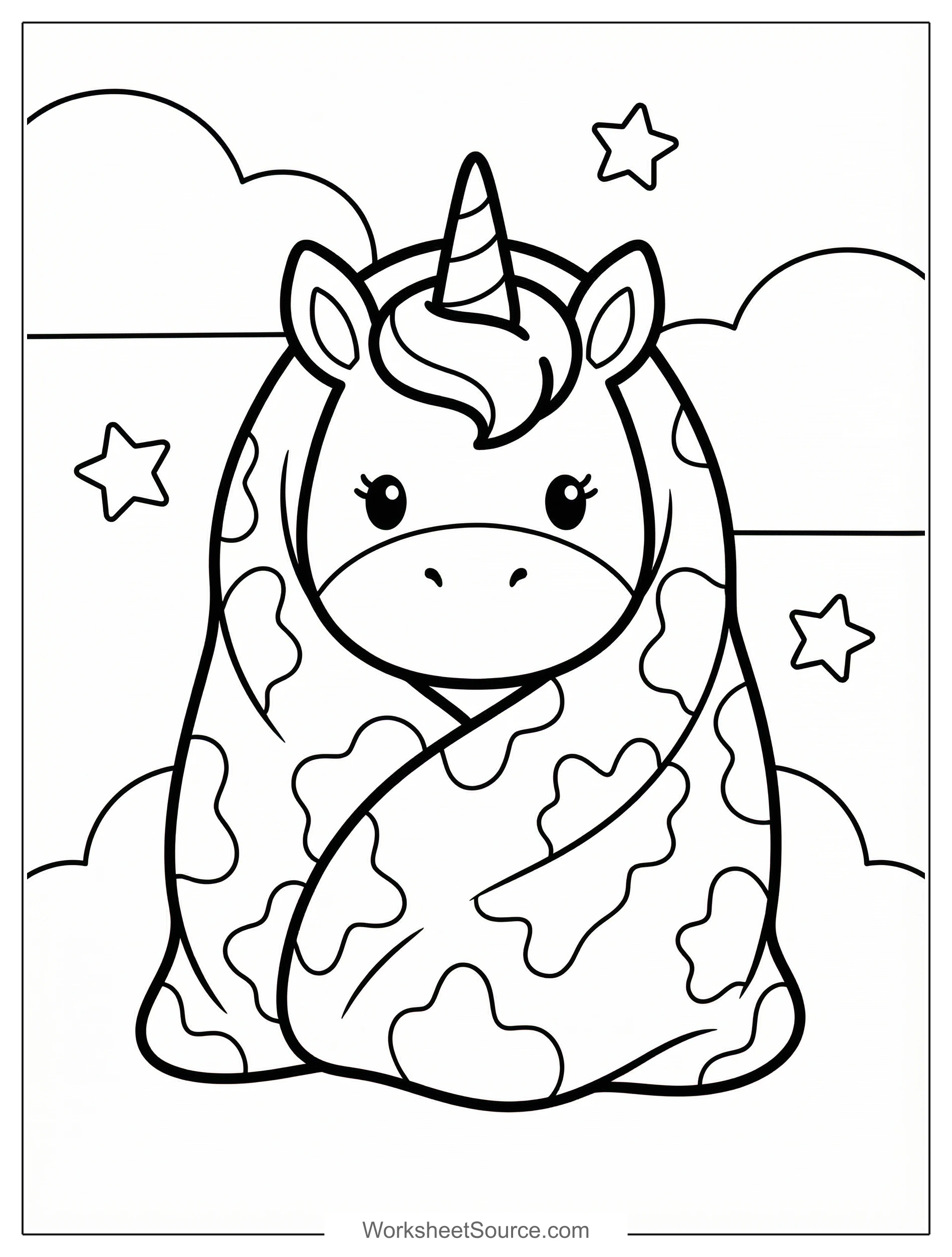 Download this free printable Baby Unicorn With Blanket coloring page for kids. It is great for classroom activities, home learning, and creative fun.