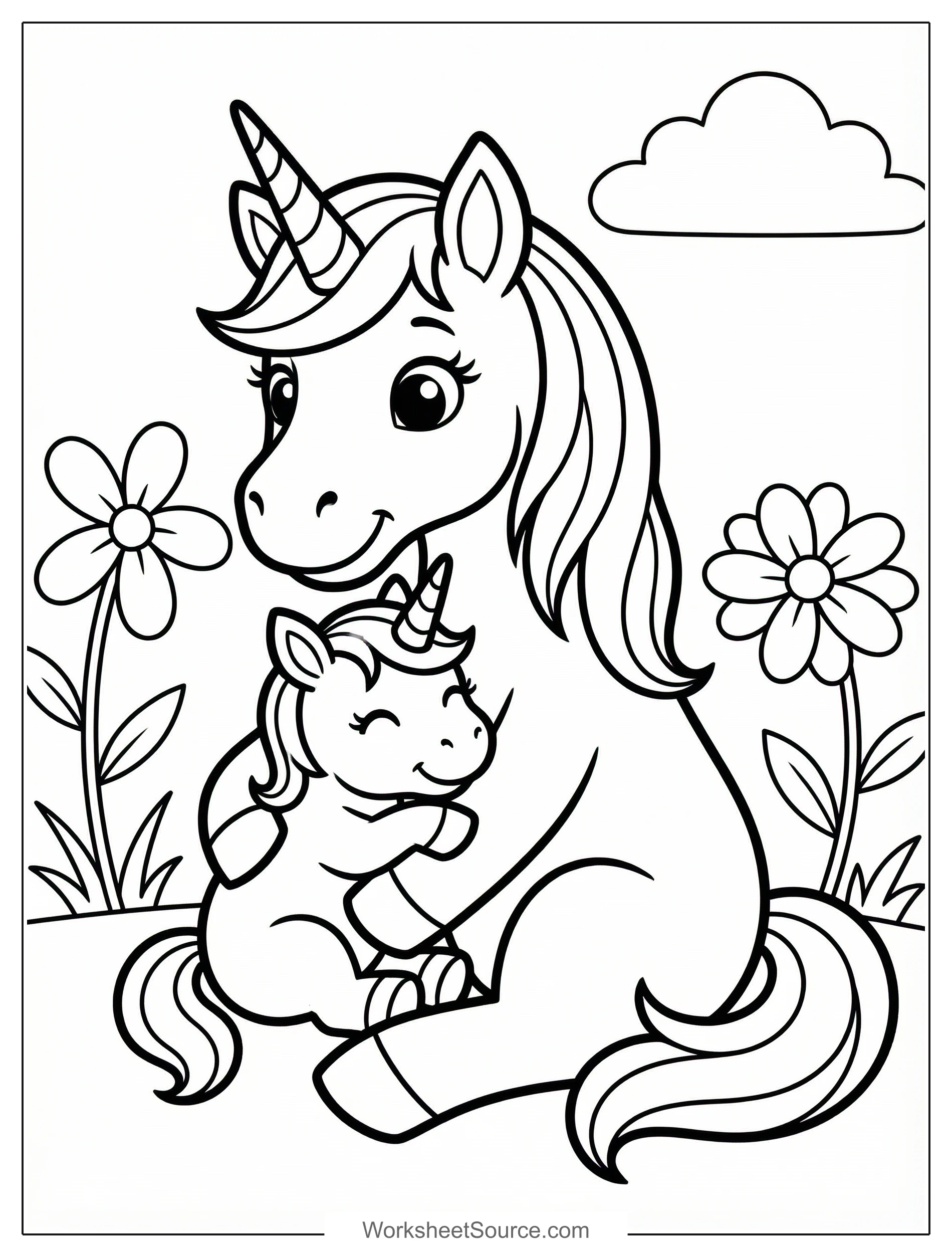 Download this free printable Baby Unicorn With Mom coloring page for kids. Great for classroom activities, home learning, and creative fun.