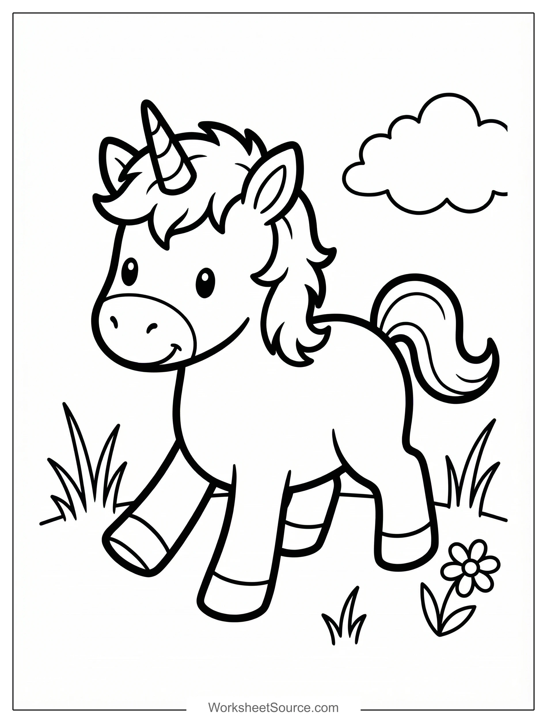 Download this free printable Little Unicorn Learning to Walk coloring page for kids. It is great for classroom activities, home learning, and creative fun.