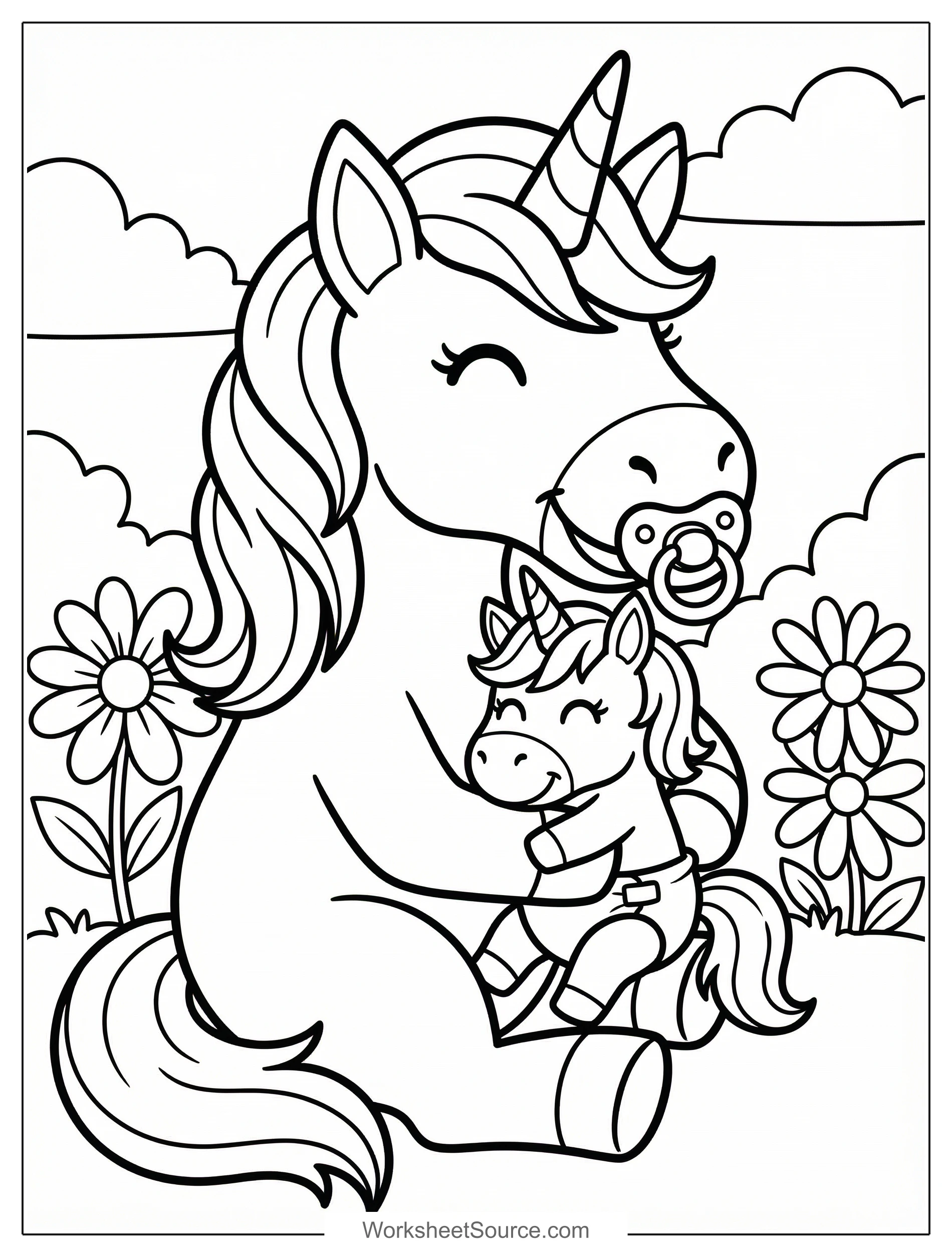 Download this free printable Tiny Unicorn With Pacifier coloring page for kids. It is great for classroom activities, home learning, and creative fun.