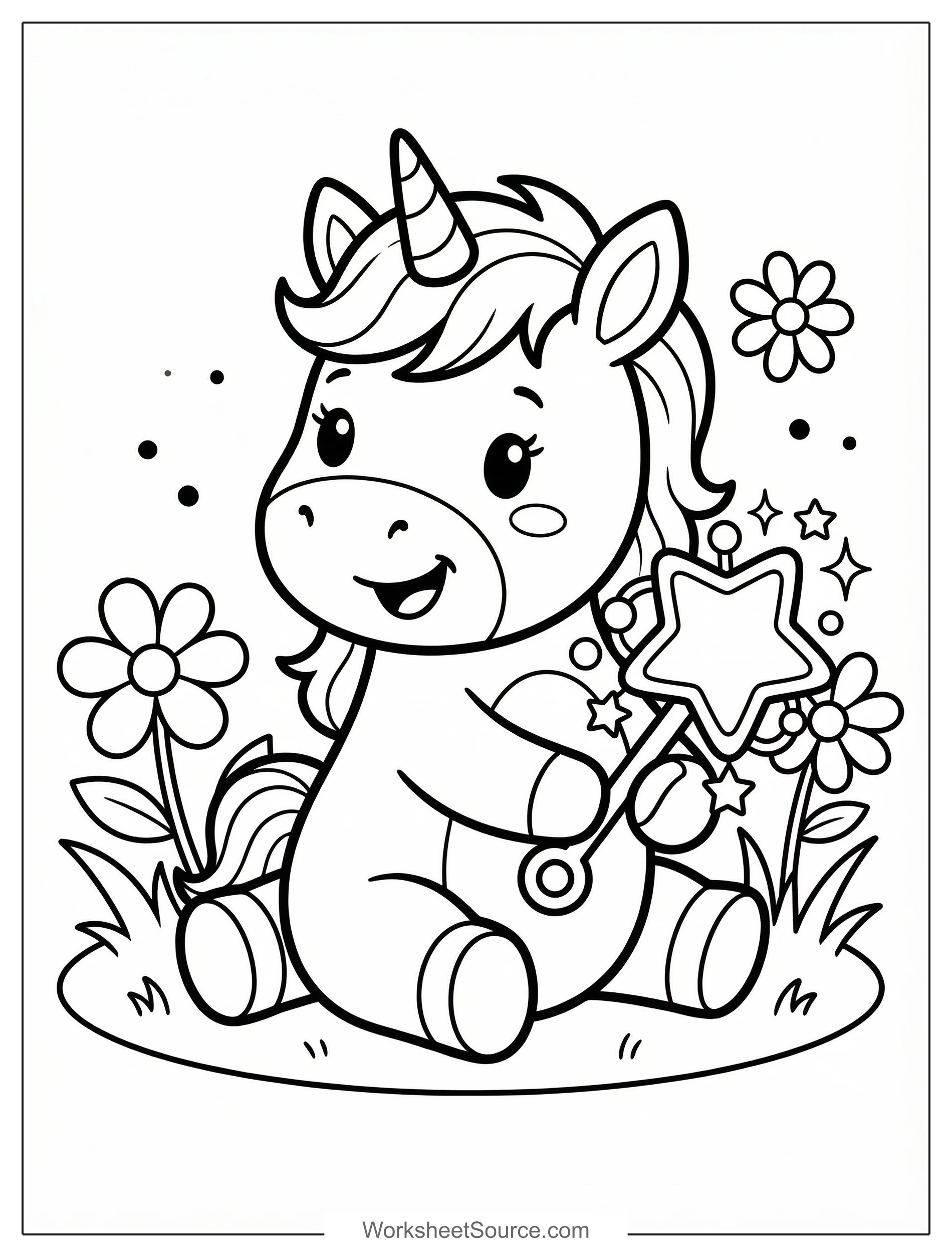 Download this free printable Tiny Unicorn With Rattle coloring page for kids. Great for classroom activities, home learning, and creative fun.