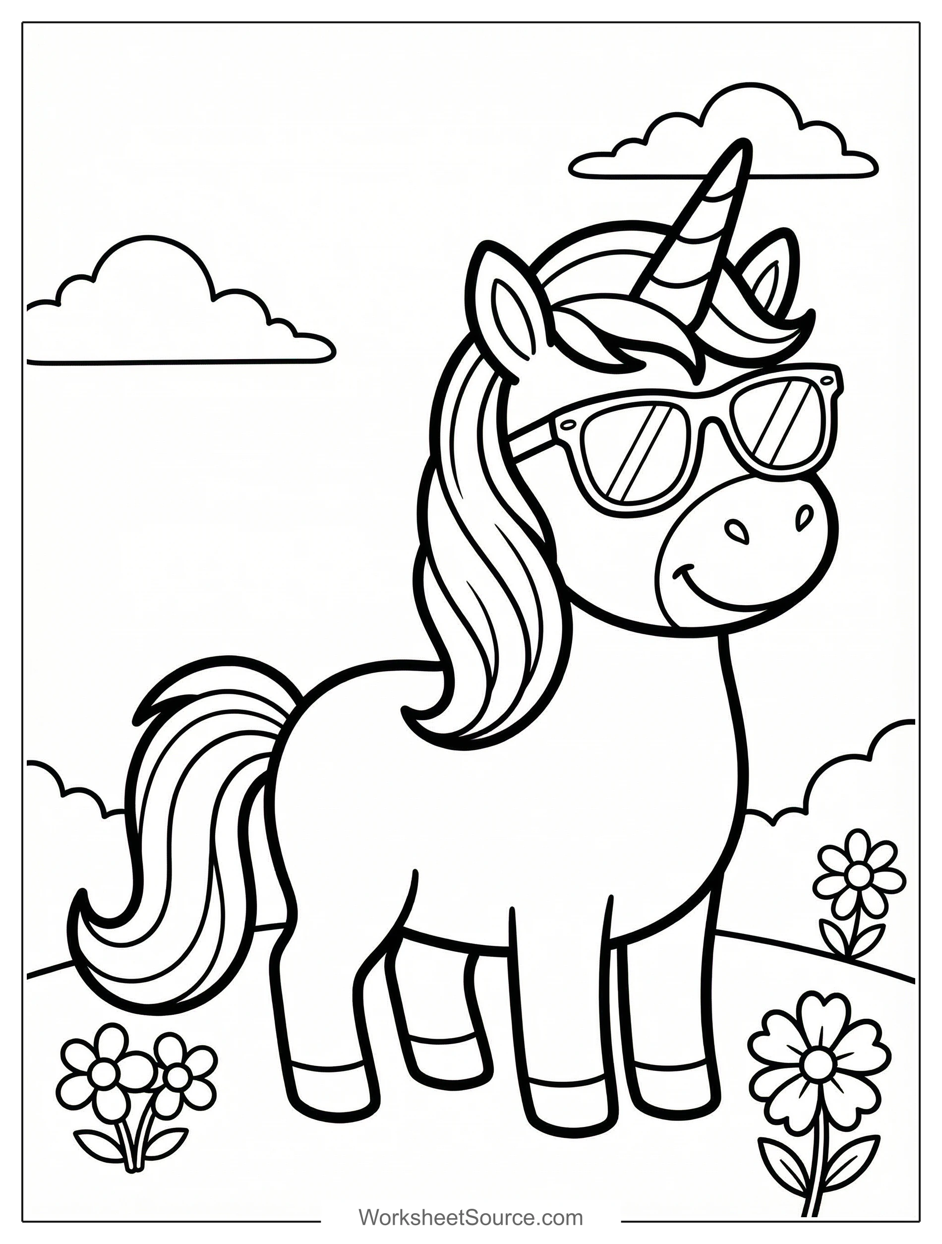Download this free printable Cartoon Unicorn With Sunglasses coloring page for kids. It is great for classroom activities, home learning, and creative fun.