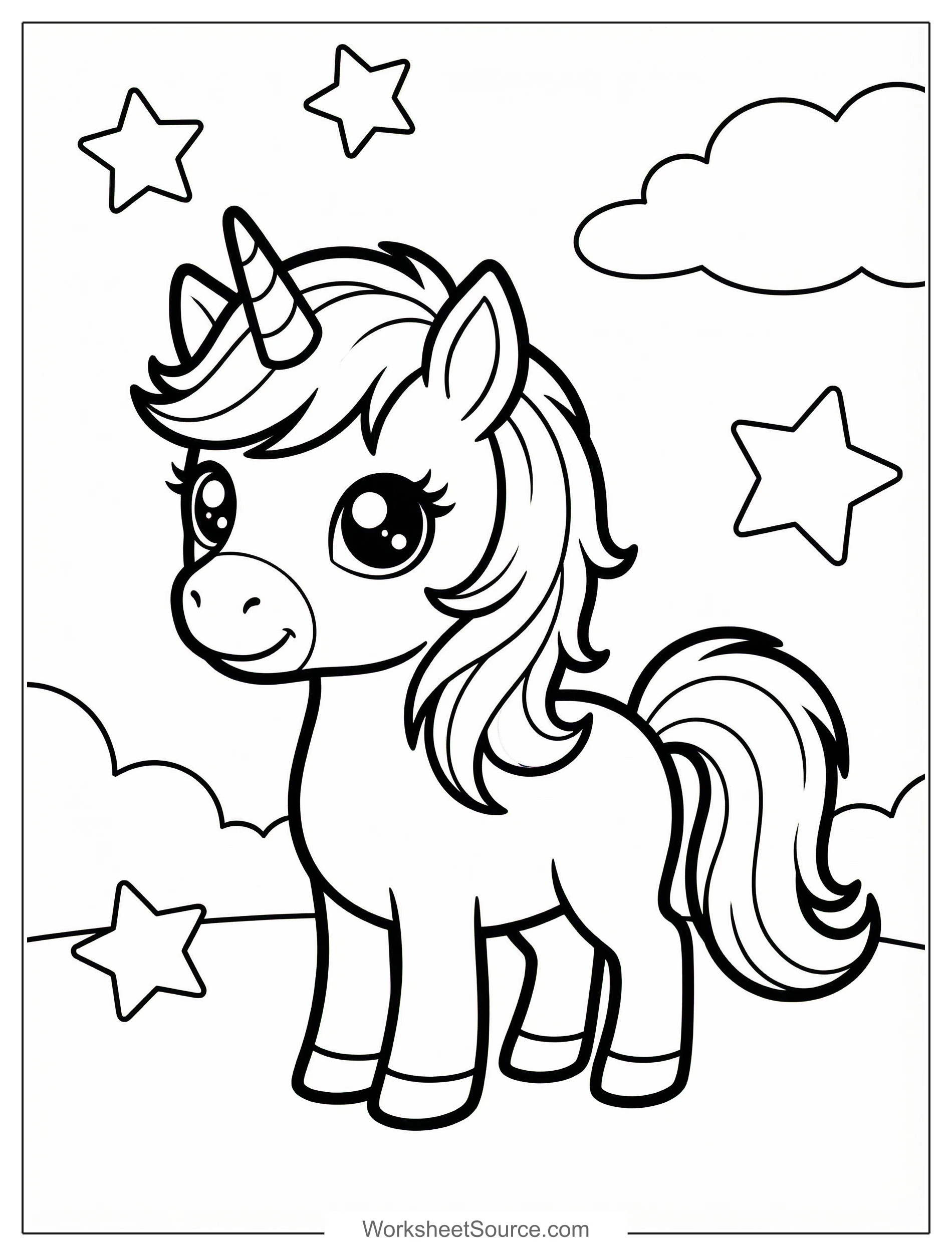 This Cute Unicorn With Big Eyes coloring page is a joyful project that invites children to explore color choices and storytelling as they work. Start by talking about the unicorn and asking what colors feel magical today, then encourage layering colors to create soft gradients in the mane and tail. For classroom use, try a coloring center where each child adds a different pattern to the stars, then display the finished pages on a bulletin board for a whimsical gallery. At home, it makes a cozy rainy day activity, or pair the page with a short story time about friendly creatures to spark imaginative writing. For a group project, have kids cut out their unicorns and create a shared rainbow mural to build teamwork and composition skills. The printable format makes it easy to reuse, photocopy, and adapt for crafts, and the cute design keeps the focus on color exploration, fine-motor practice, and creative play.