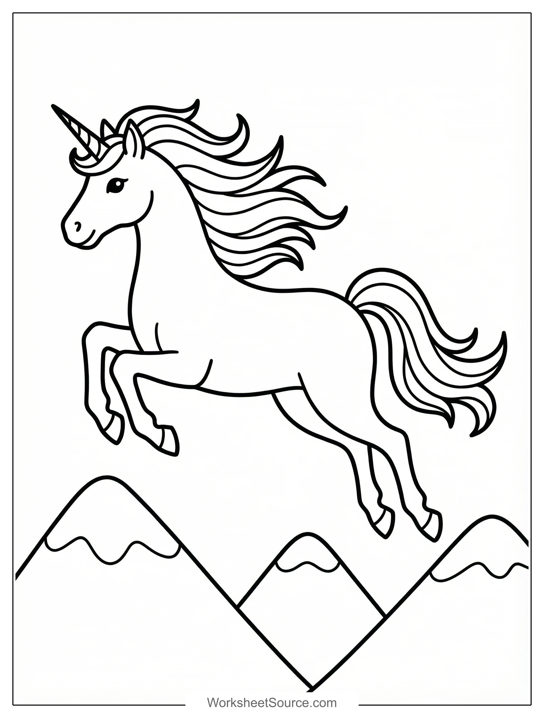 Download this free printable Unicorn Flying Over Mountains coloring page for kids. It is great for classroom activities, home learning, and creative fun.