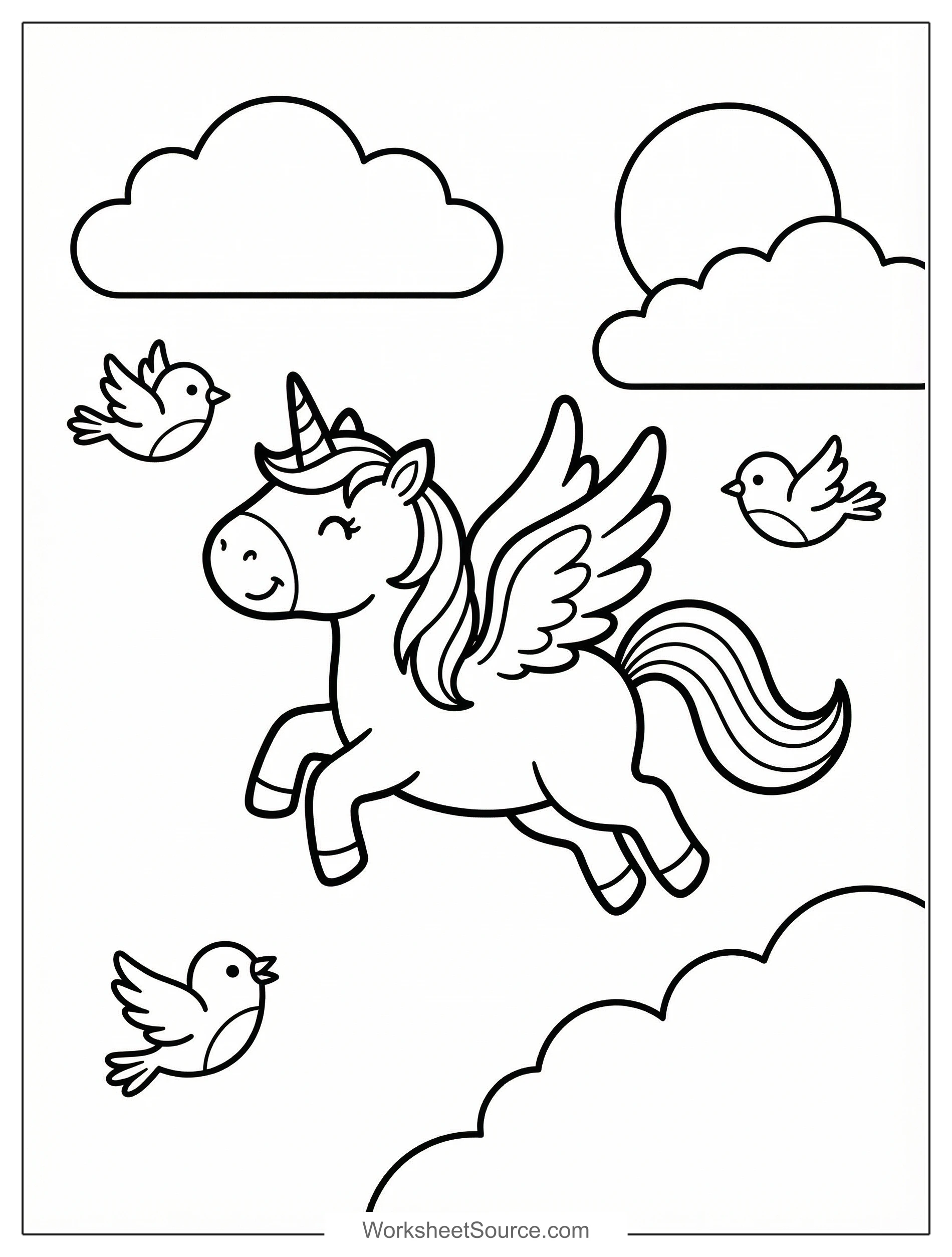 Unicorn Flying With Birds Coloring Page