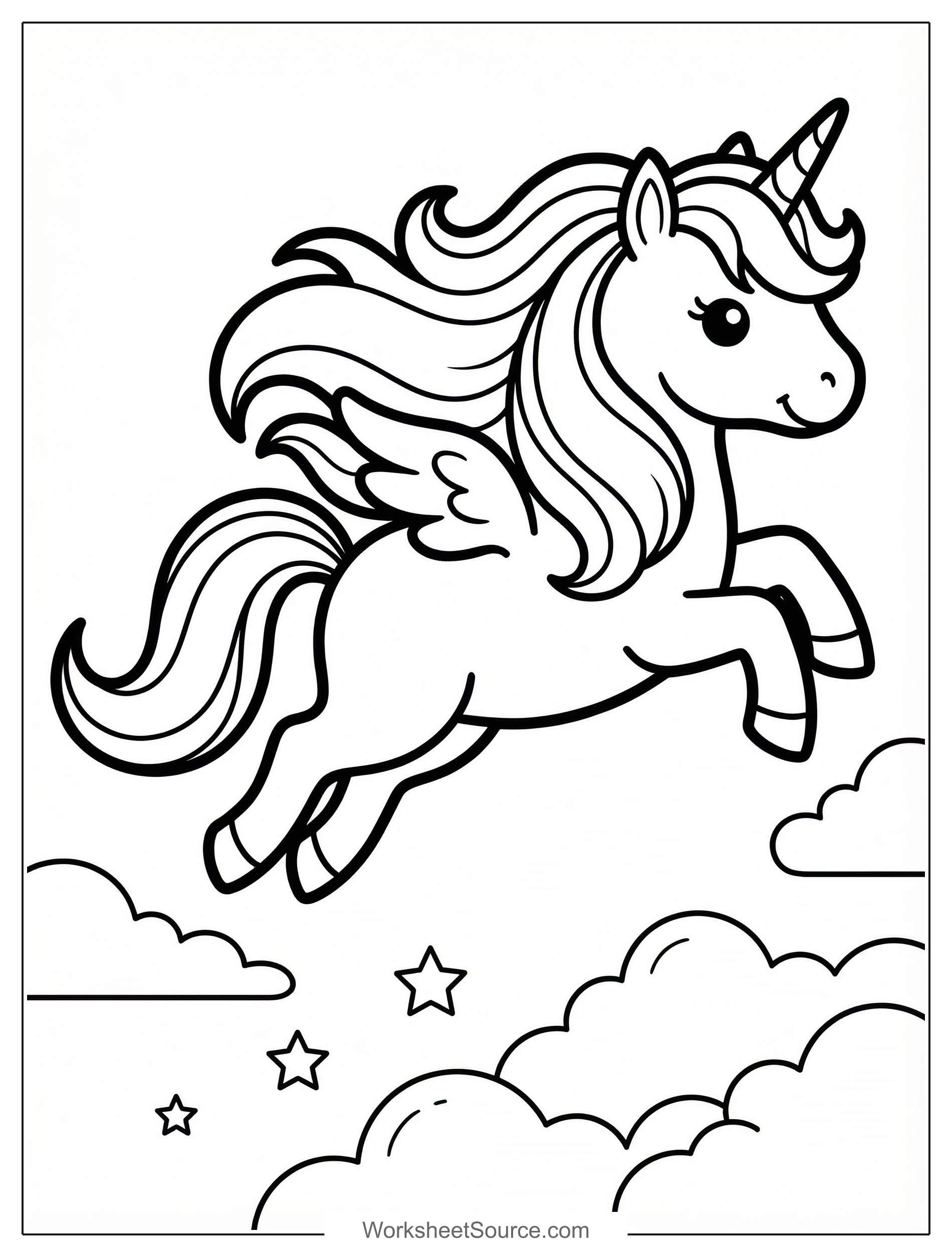 Download this free printable Unicorn Gliding Through Air coloring page for kids. Great for classroom activities, home learning, and creative fun.