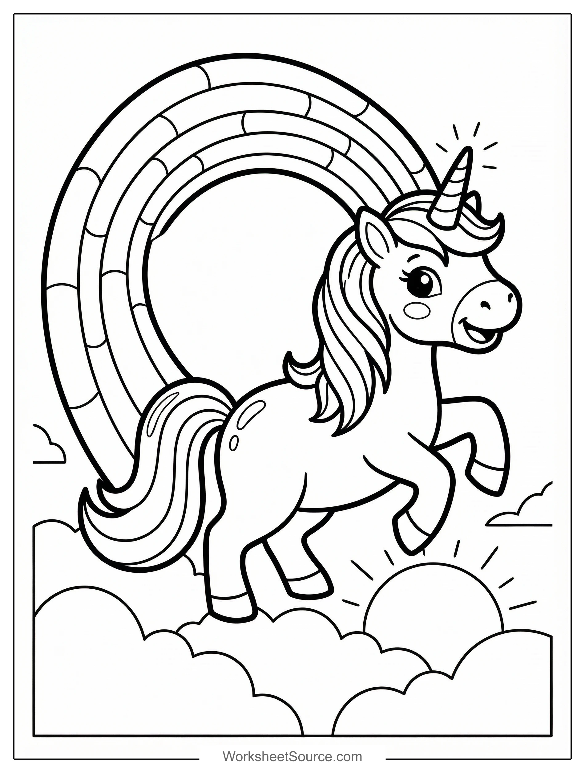 Use bright rainbow colors for the arch, try red, orange, yellow, green, blue, indigo, and violet in order. Color the unicorn with a soft pastel body and a vibrant mane, and add light shading along the belly and legs to give the unicorn dimension. Use a glitter gel pen on the horn and sun rays to make the picture sparkle.