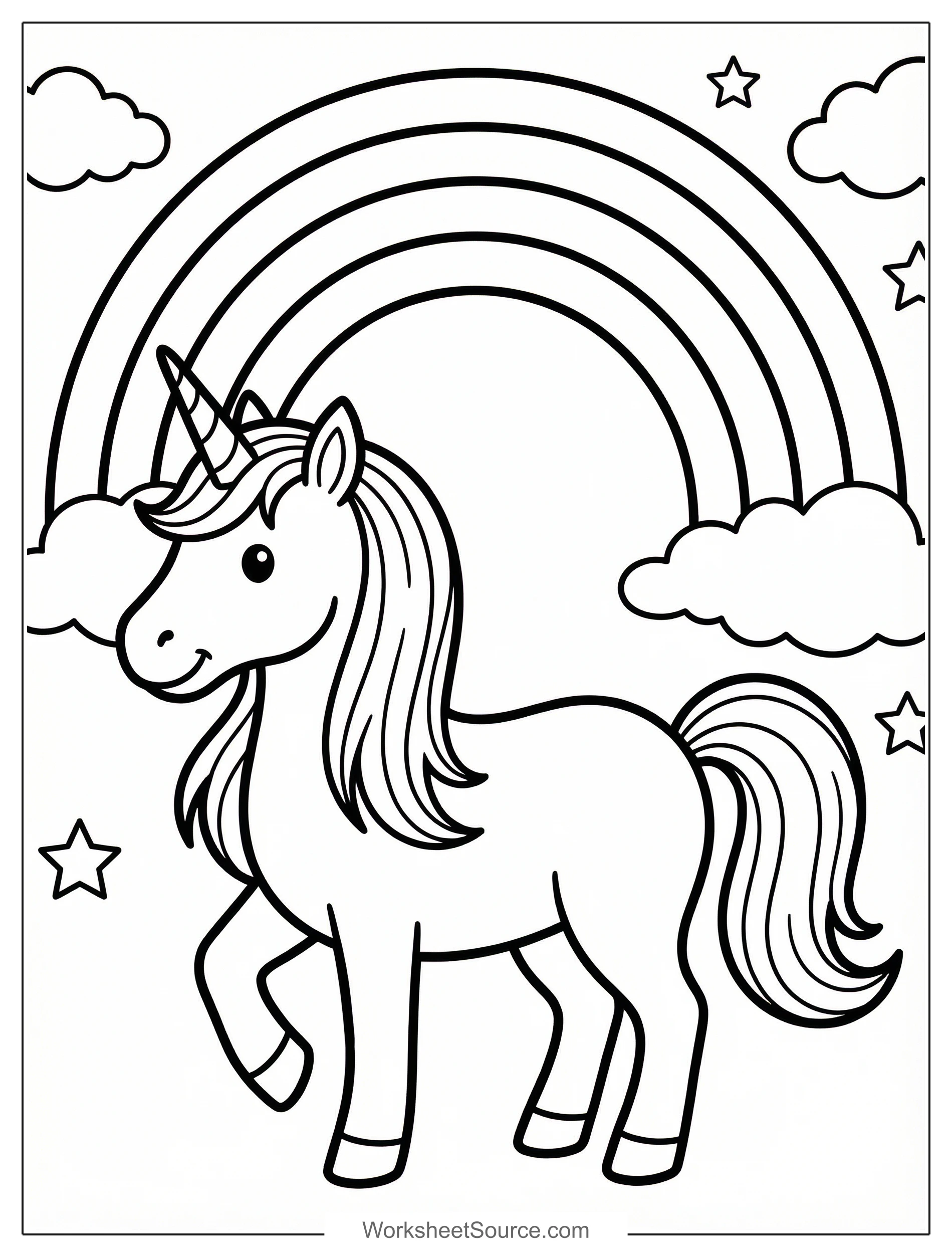 Download this free printable Unicorn Under Rainbow Arch coloring page for kids. Great for classroom activities, home learning, and creative fun.