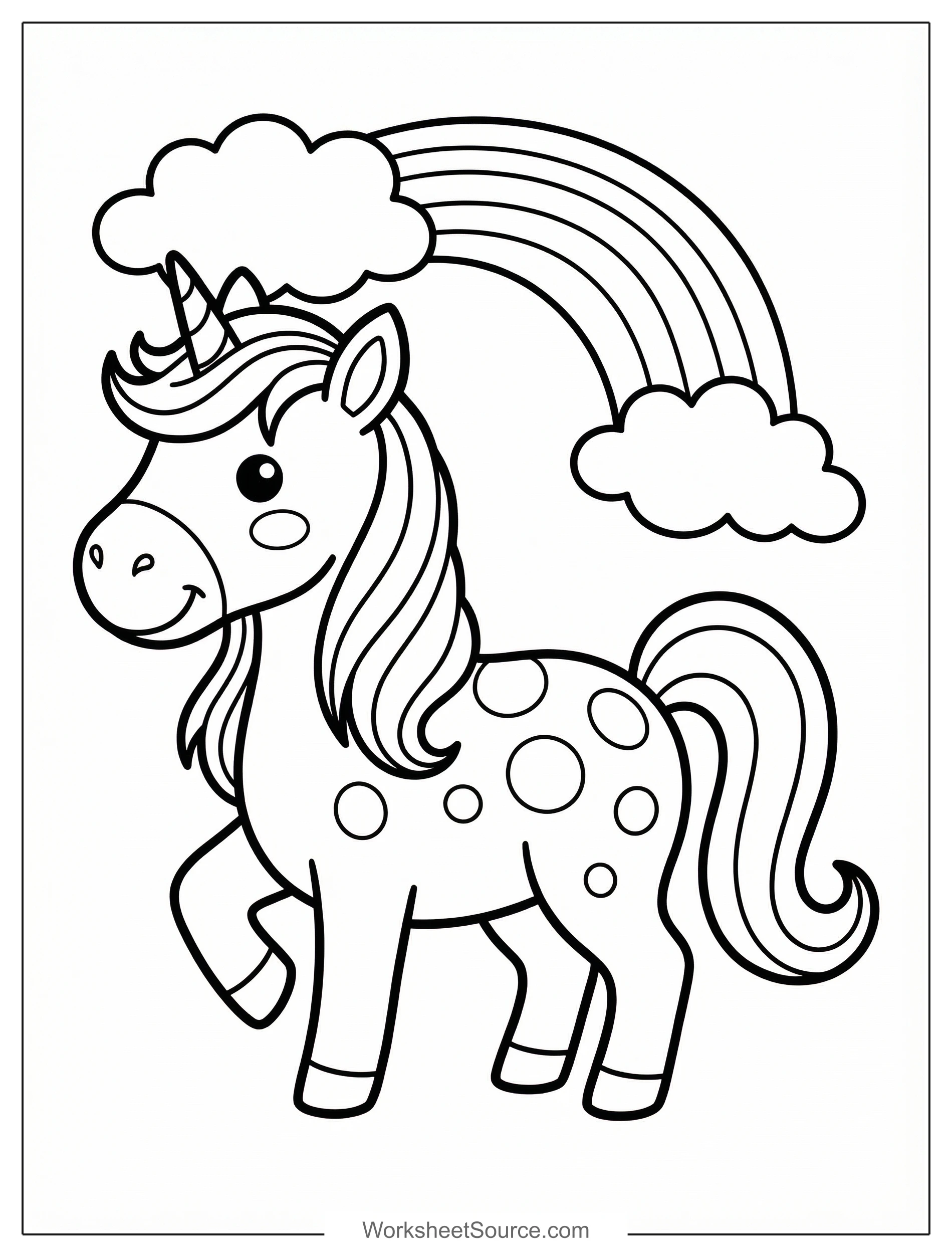 Download this free printable Unicorn With Rainbow Spots coloring page for kids. Great for classroom activities, home learning, and creative fun.
