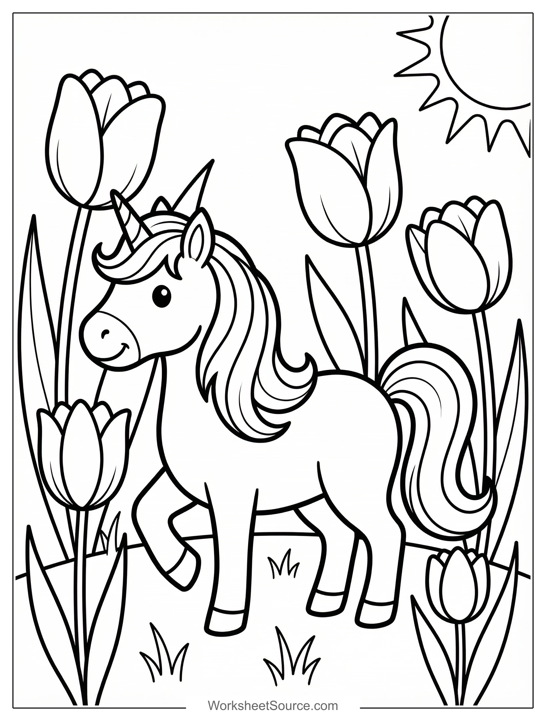 Download this free printable Unicorn Among Tulips coloring page for kids. It is great for classroom activities, home learning, and creative fun.