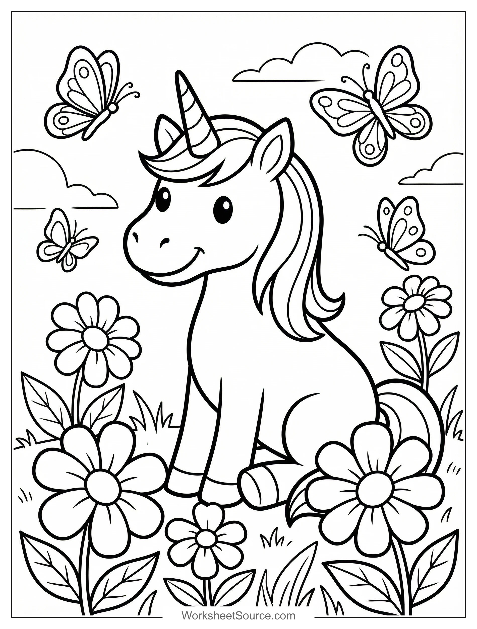About This Unicorn and Butterflies in Flowers Coloring Page
