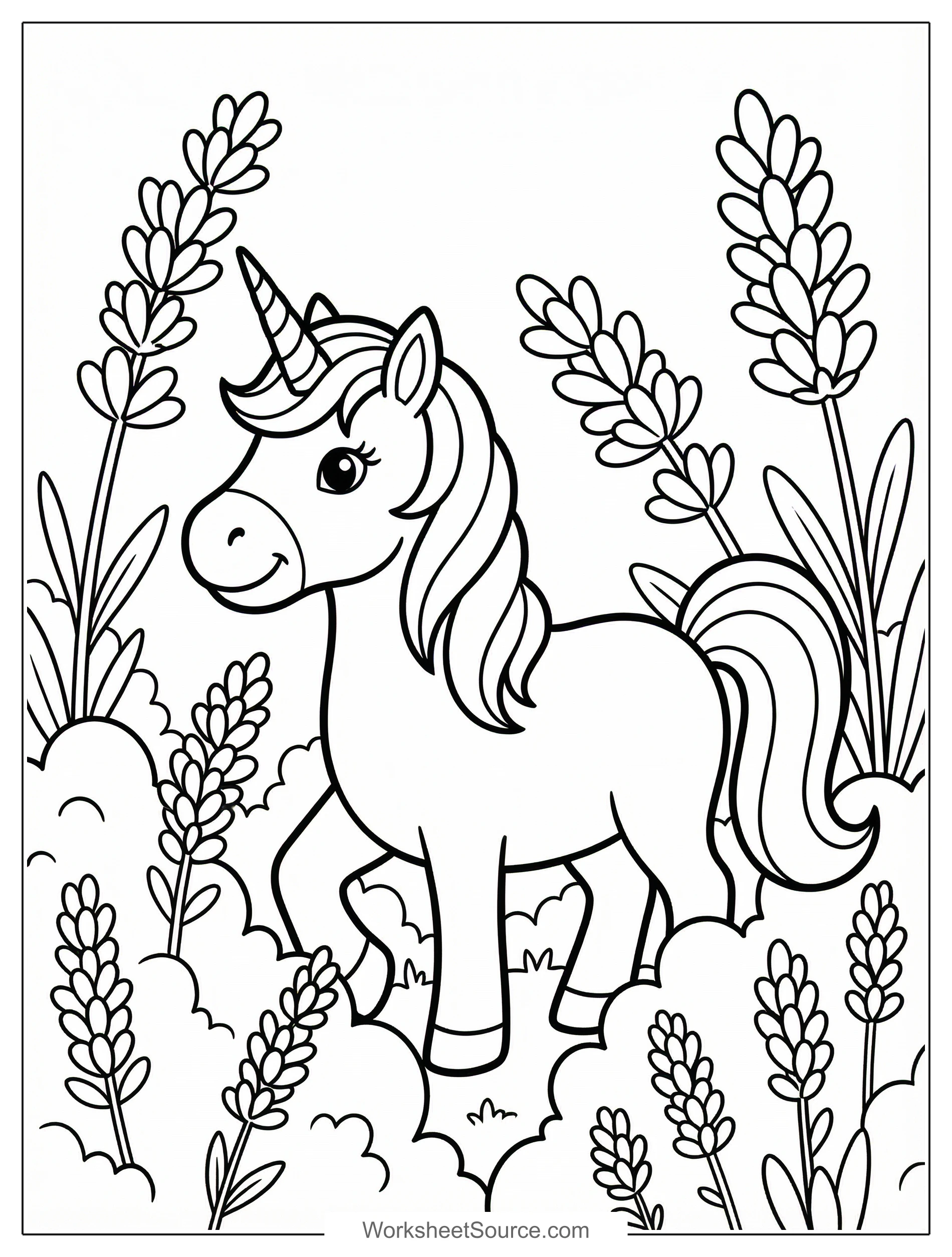 Download this free printable Unicorn and Lavender coloring page for kids. Great for classroom activities, home learning, and creative fun.