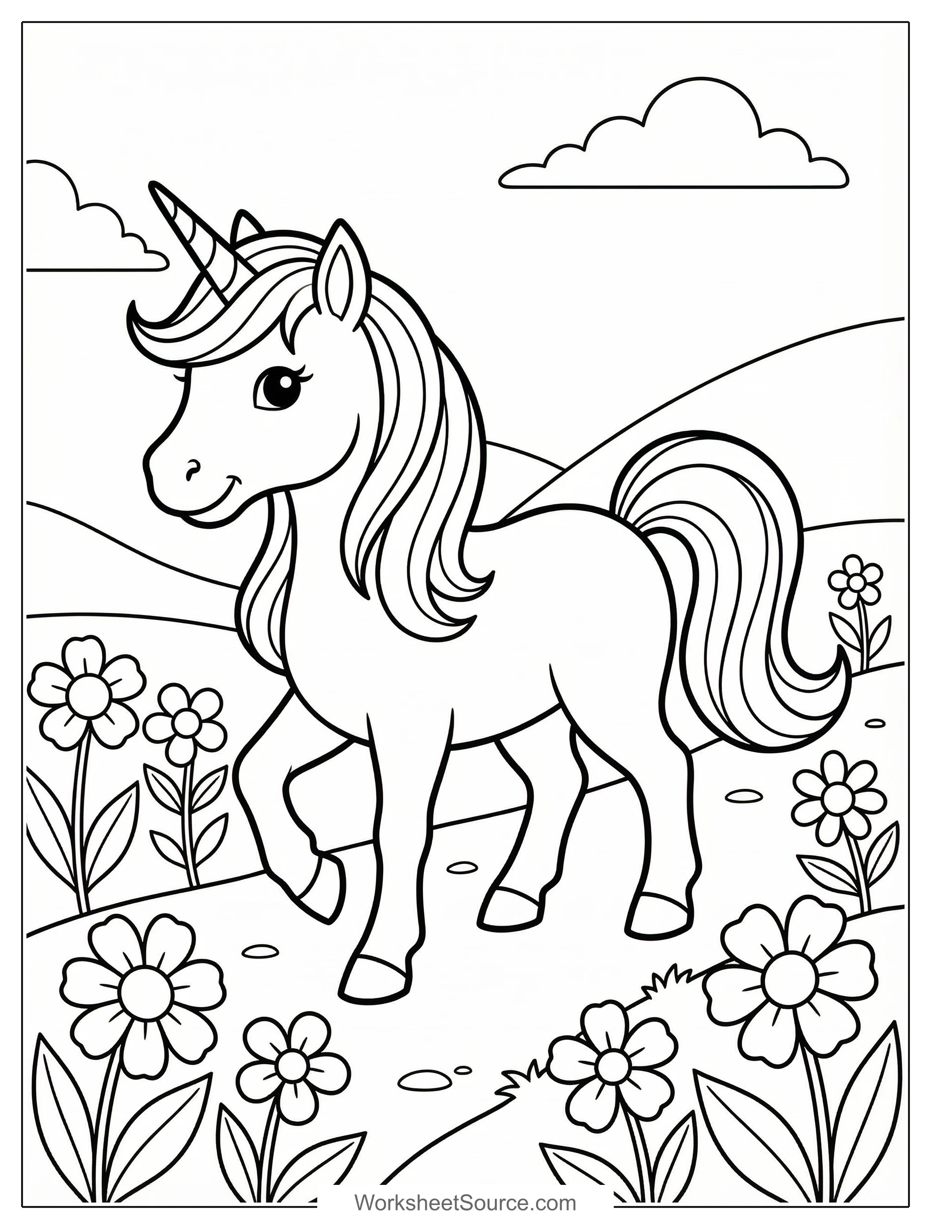 Use soft pastels like pale pinks, lavenders, and baby blues for the unicorn mane and tail, then add brighter accents like teal or gold to make it pop. Color the flowers with a mix of warm hues such as yellow and coral, shade the hills with layered greens, and add light strokes along the unicorn body to show gentle shading and roundness.