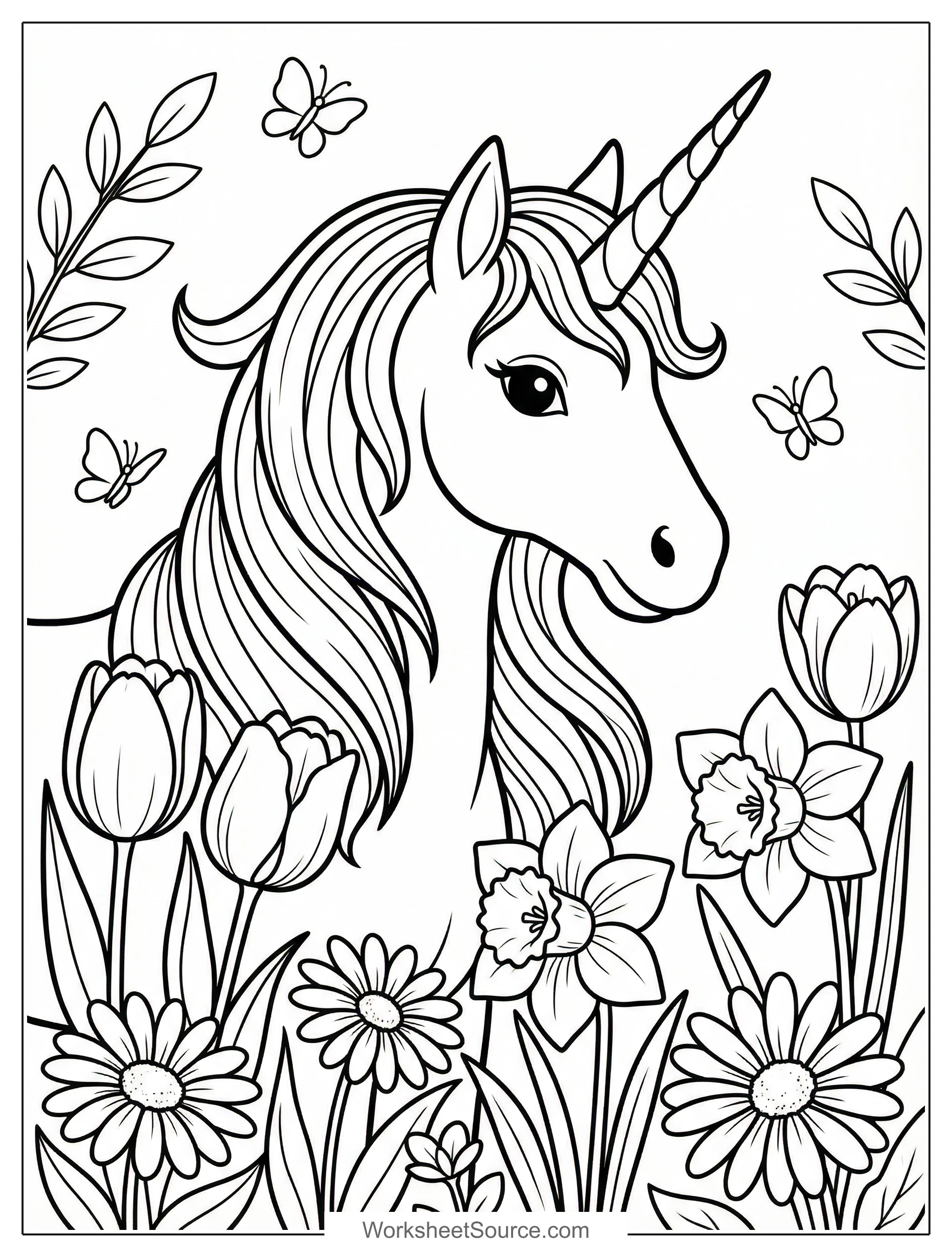 Imagine a gentle unicorn standing in a garden full of blooms, each petal waiting for color. This Unicorn in Bloom coloring page is so fun because the flowing mane, spiraled horn, and detailed flowers all invite different color choices and small, careful strokes. Teachers can cut a set for a spring center, add a writing prompt about what the unicorn smells like, and display finished pages on a bulletin board in a bright spring gallery. At home this printable turns a rainy afternoon into a creative family project. Try pairing it with a short story about a garden adventure, or make a game of mixing two colors to make new shades. Coloring the different flowers helps with observation, and choosing colors builds imagination as kids decide what a magical garden looks like. Suggest using crayons for broad areas, colored pencils for fine lines, and a white crayon for highlights to make petals shine. This printable is free and easy to share, and it makes a simple, joyful way to add color to learning and play.