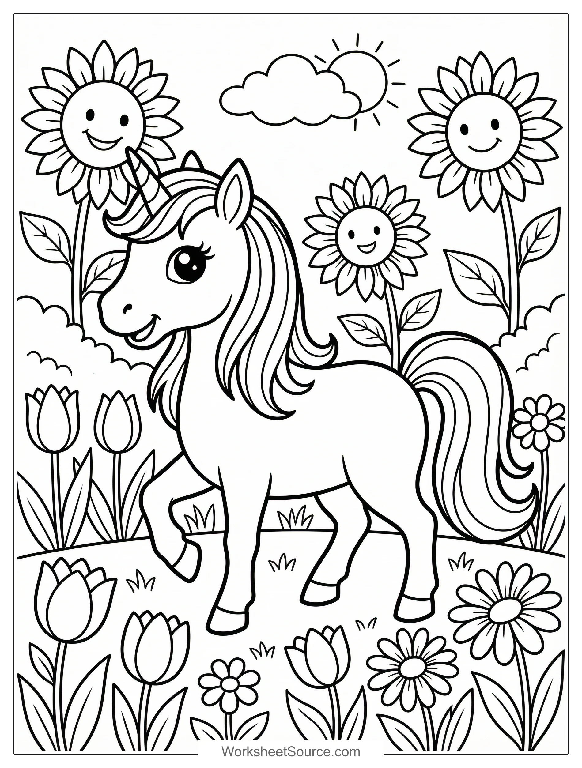 Unicorn in Flower Garden Coloring Page