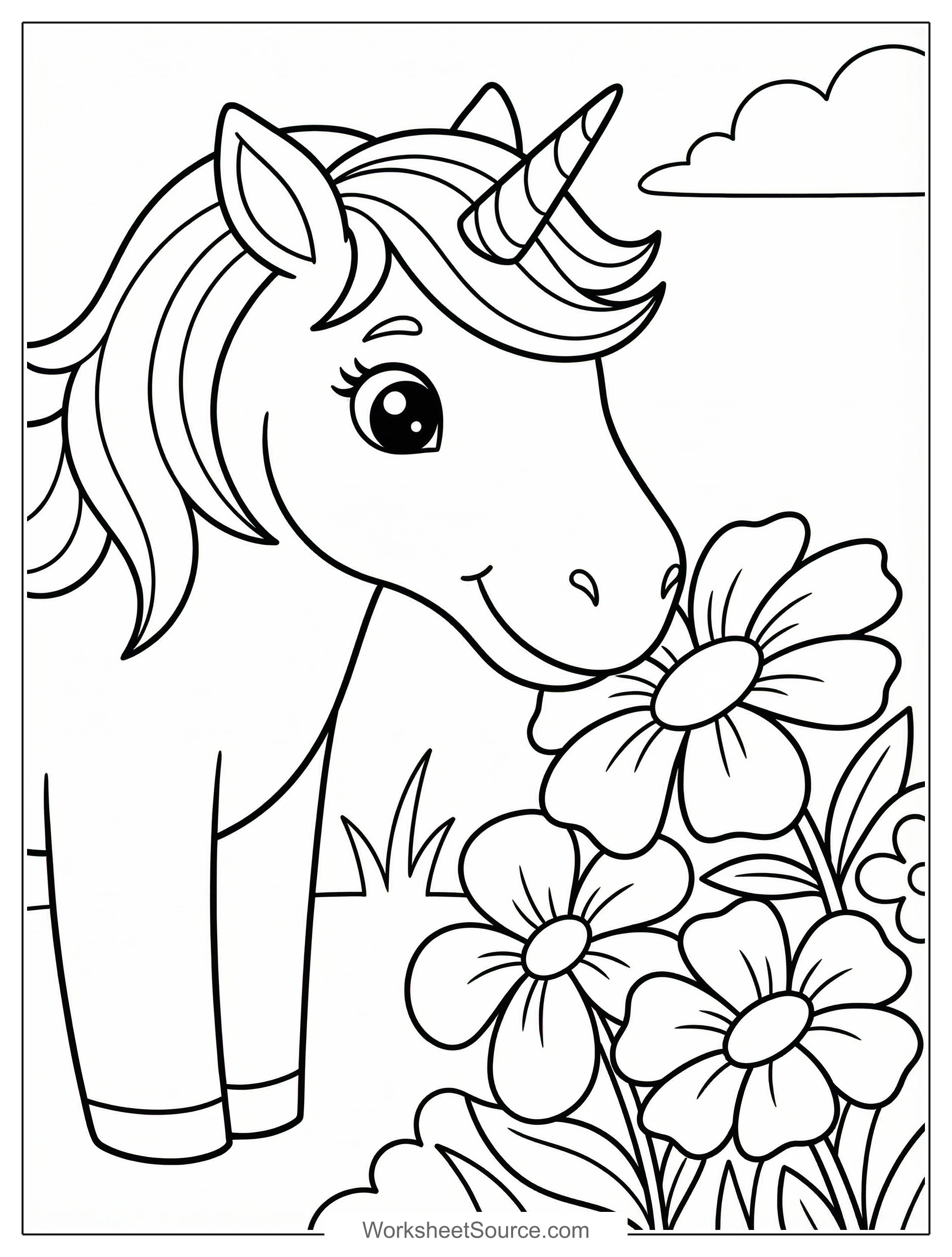Download this free printable Unicorn Smelling Flowers coloring page for kids. Great for classroom activities, home learning, and creative fun.