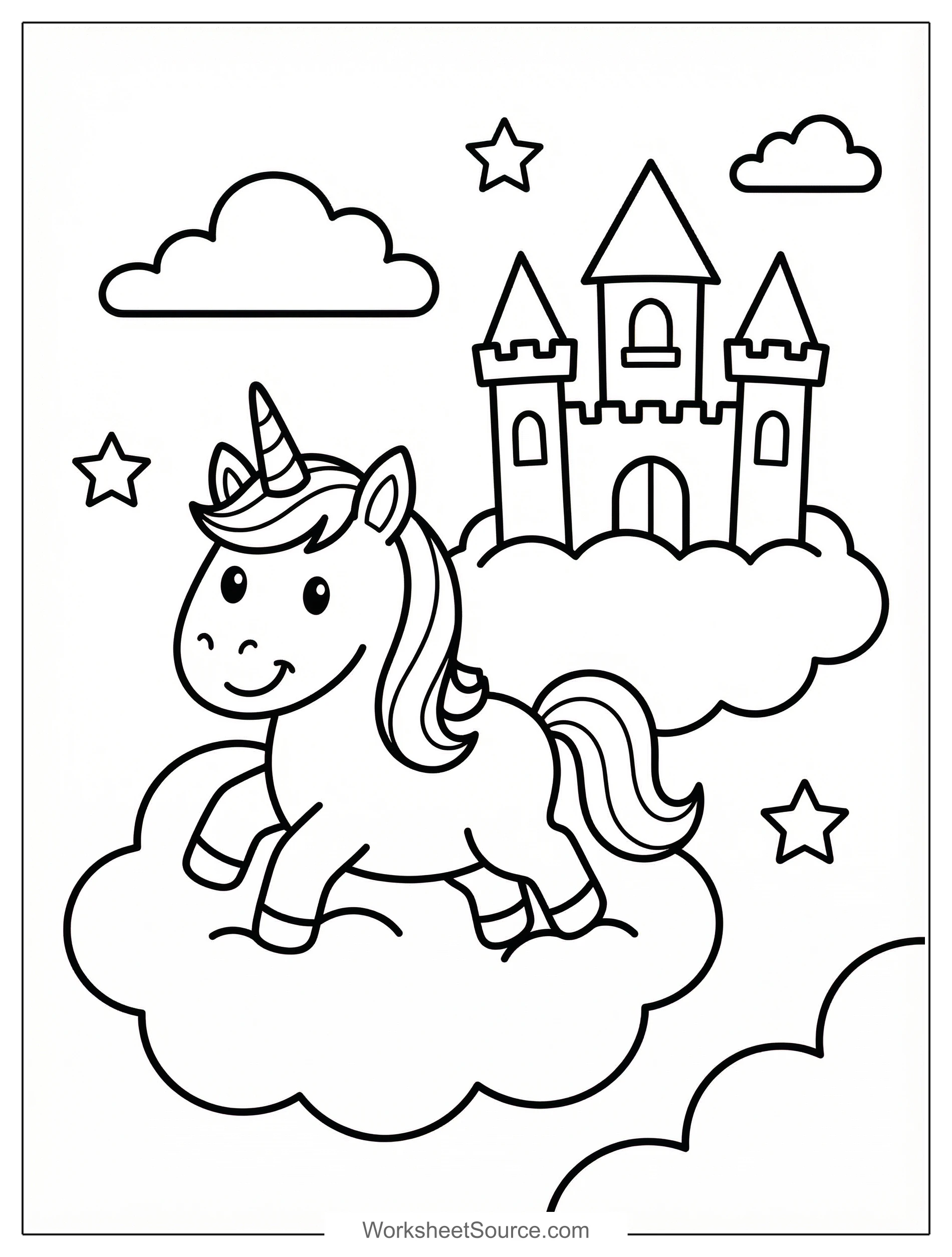 Download this free printable Cloud Castle With Unicorn coloring page for kids. Great for classroom activities, home learning, and creative fun.