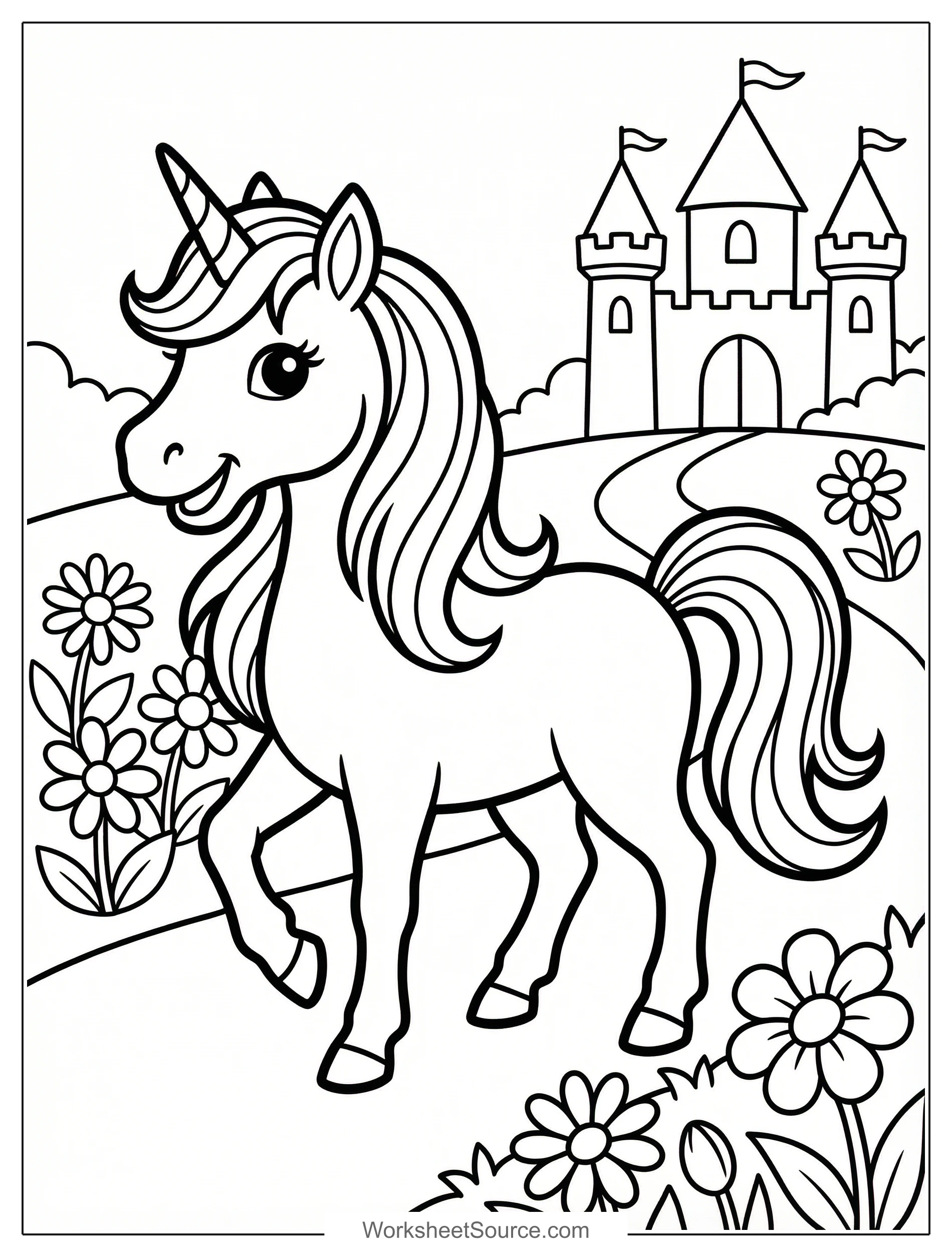 Download this free printable Unicorn in Castle Garden coloring page for kids. Great for classroom activities, home learning, and creative fun.
