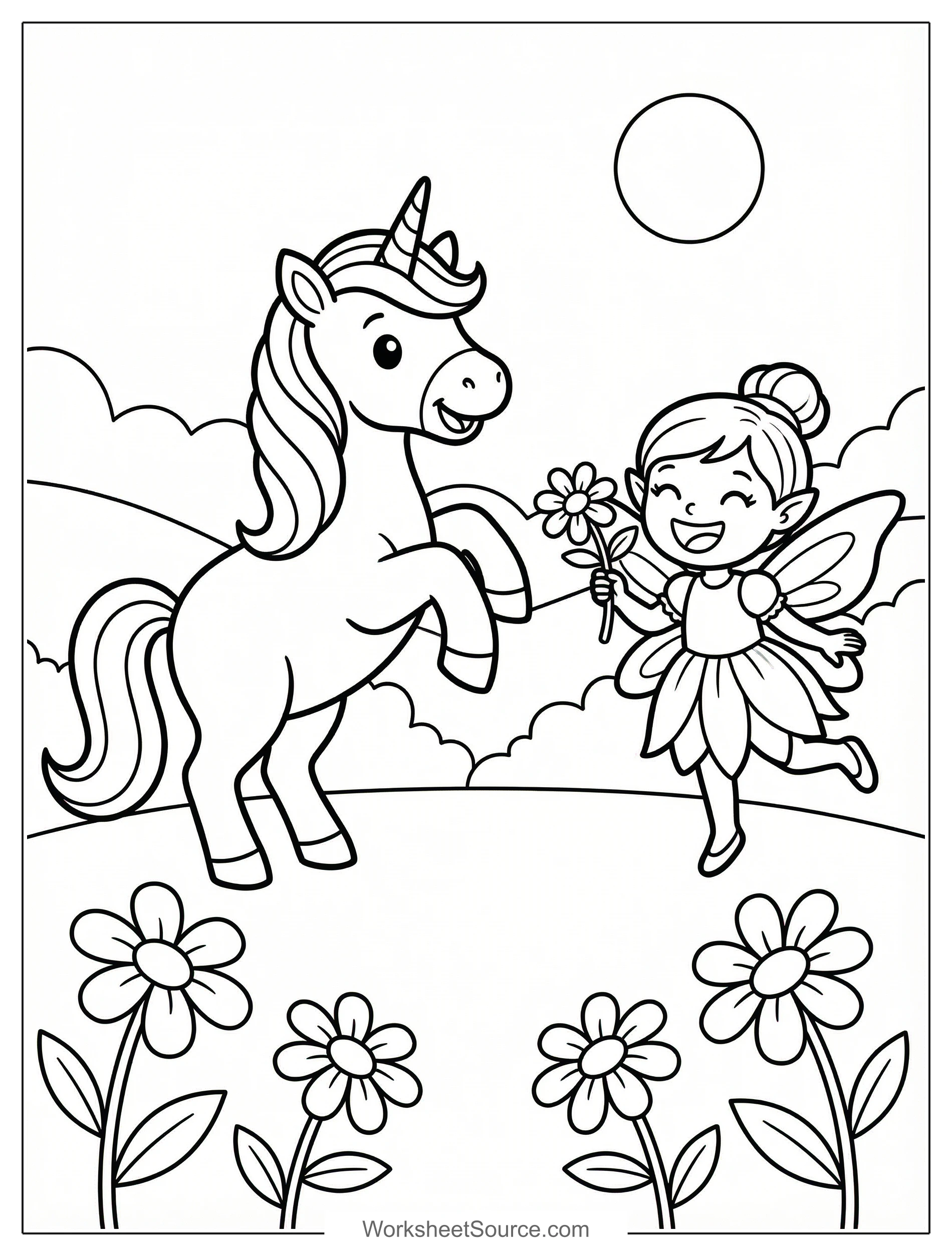 Download this free printable Unicorn and Fairy Friends coloring page for kids. It is great for classroom activities, home learning, and creative fun.