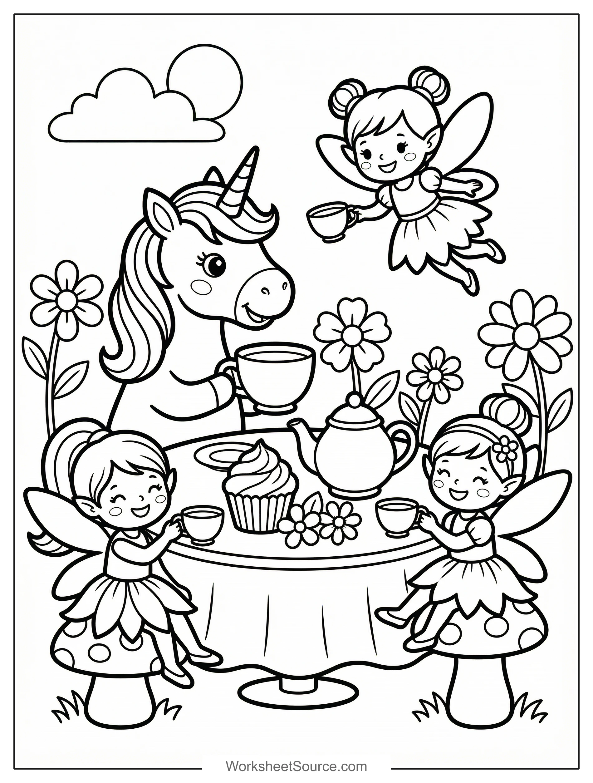 Download this free printable Unicorn and Fairy Tea Party coloring page for kids. Great for classroom activities, home learning, and creative fun.