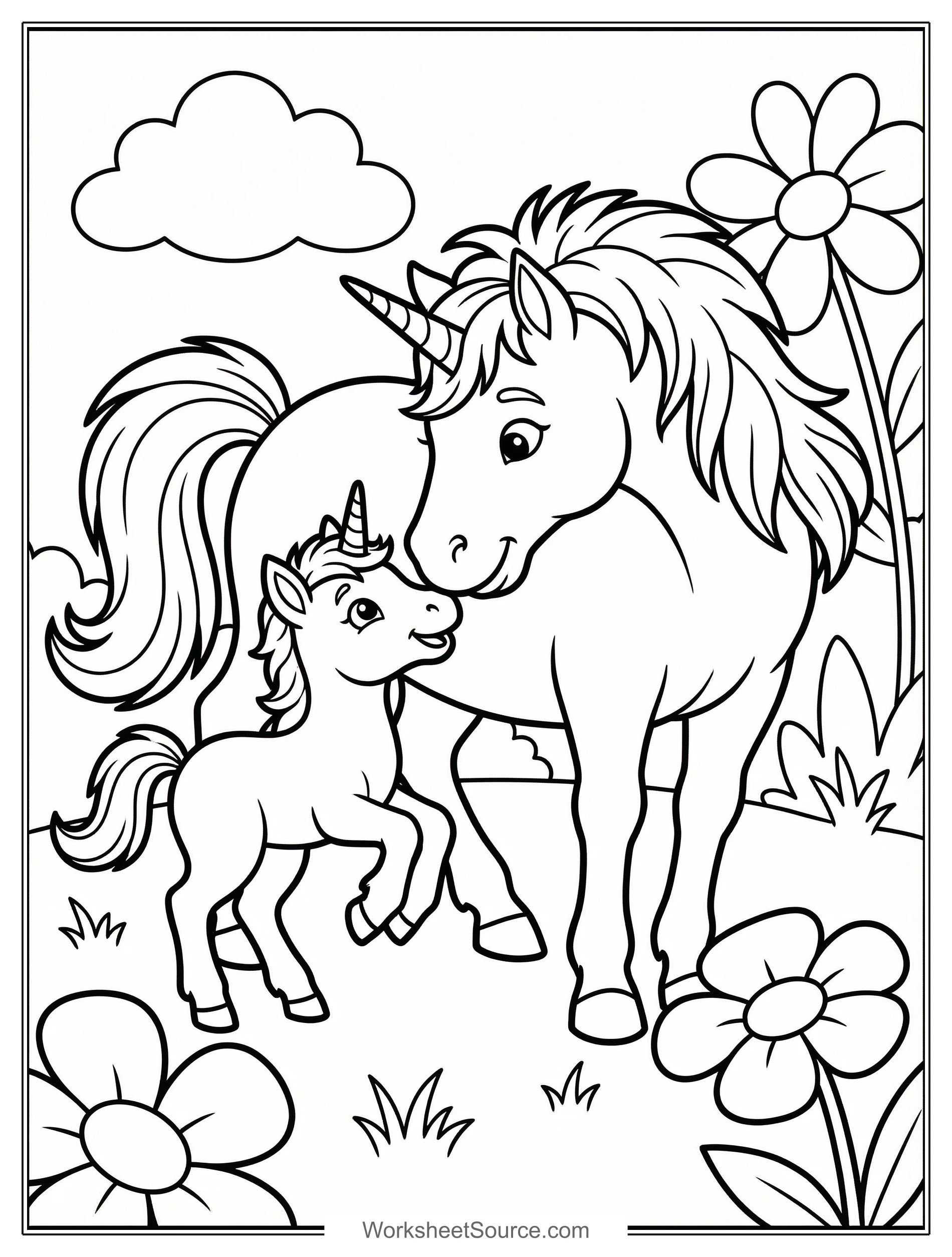 Download this free printable Dad and Young Unicorn Playing coloring page for kids. Great for classroom activities, home learning, and creative fun.