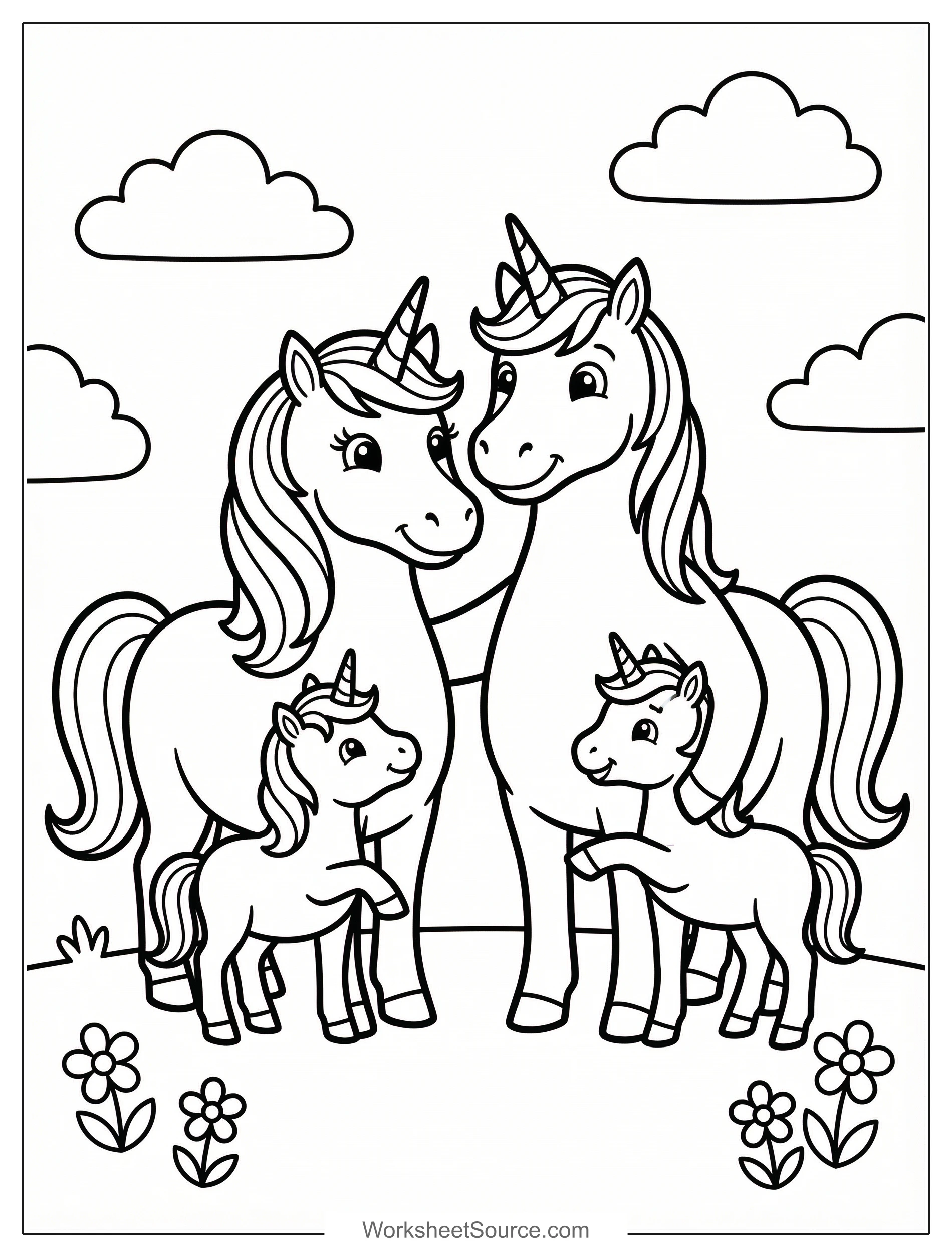 Download this free printable Twin Unicorns With Parents coloring page for kids. Great for classroom activities, home learning, and creative fun.