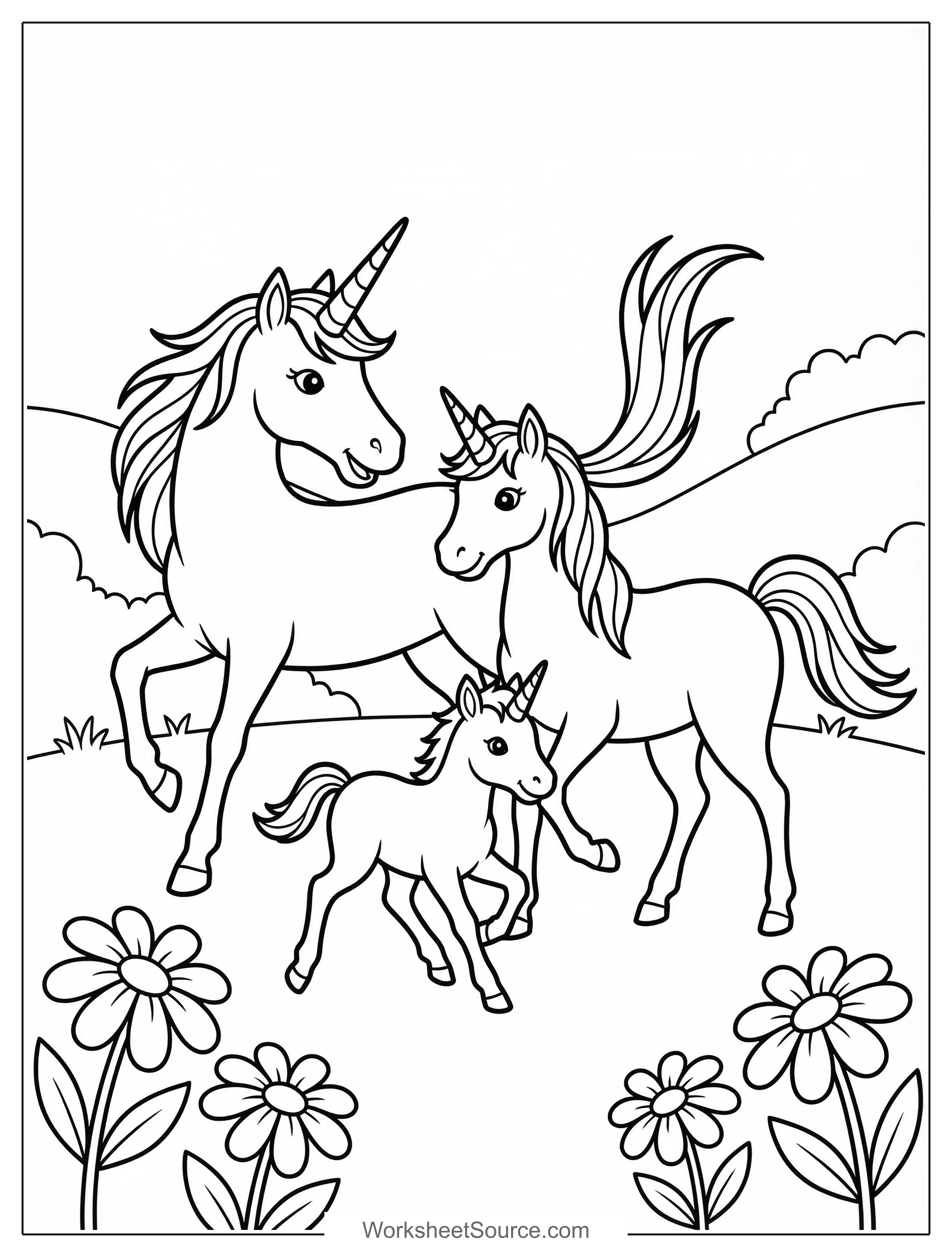 About This Unicorn Family Running Coloring Page
