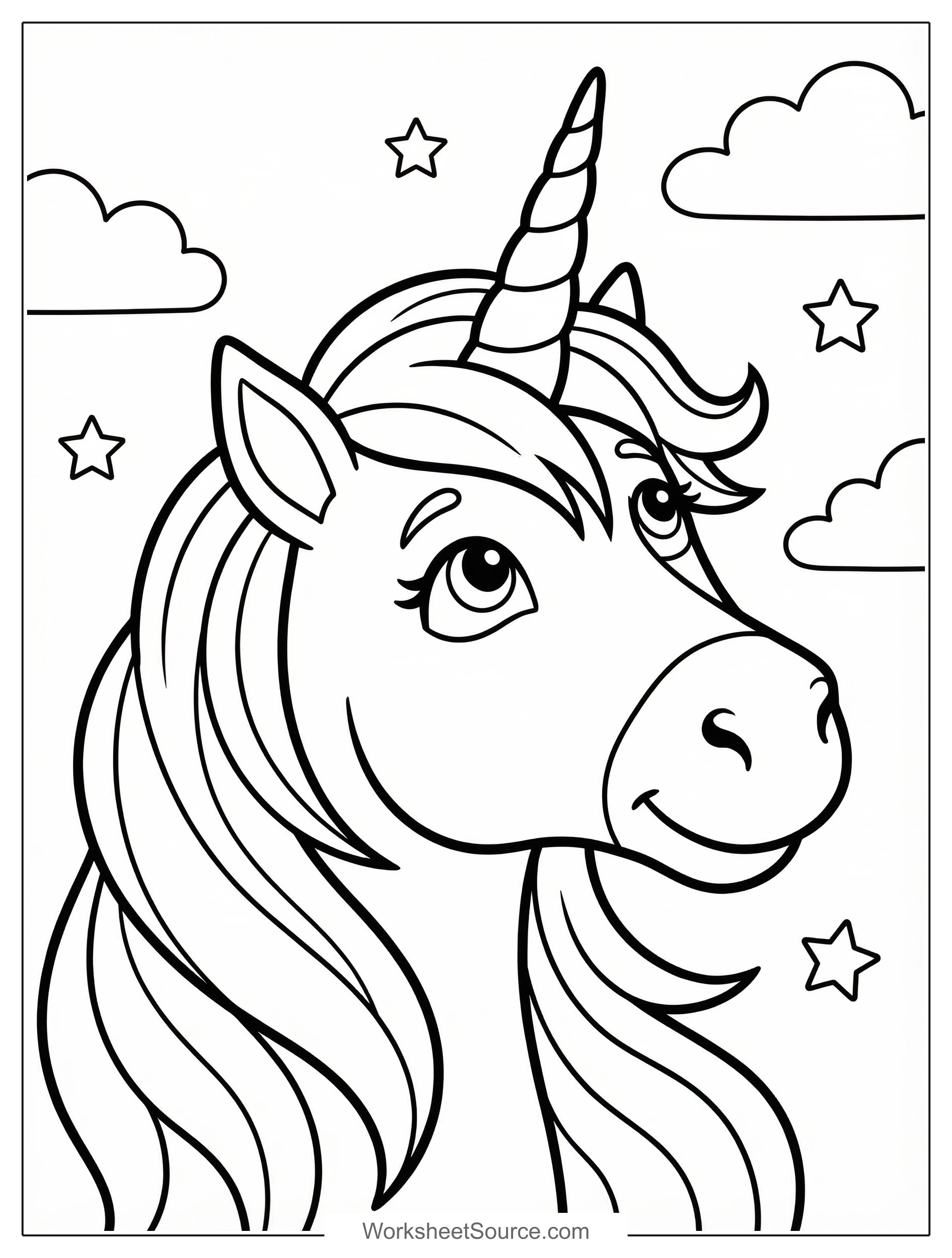 Download this free printable Unicorn Head Looking Up coloring page for kids. Great for classroom activities, home learning, and creative fun.