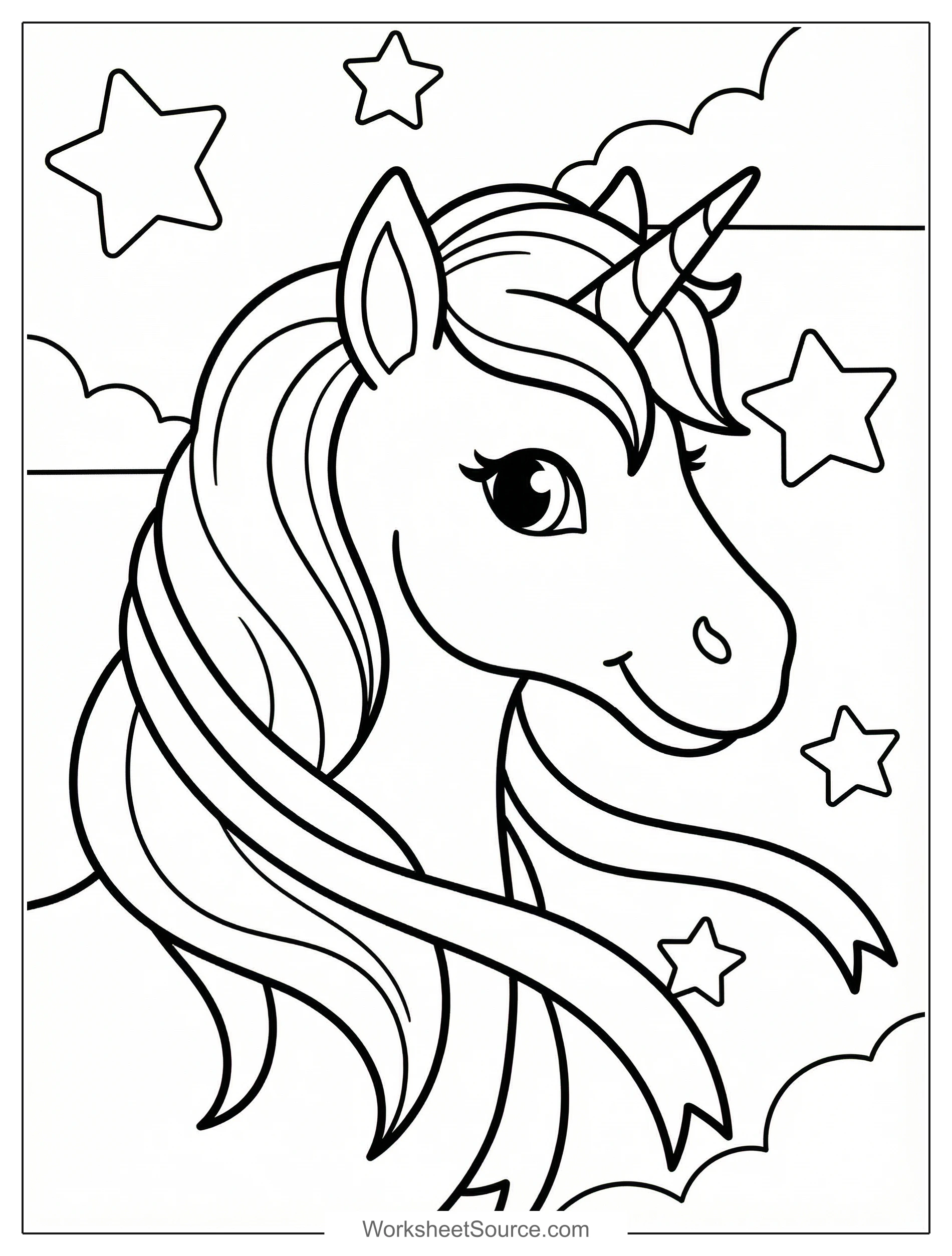 Download this free printable Unicorn Head With Ribbons coloring page for kids. Great for classroom activities, home learning, and creative fun.