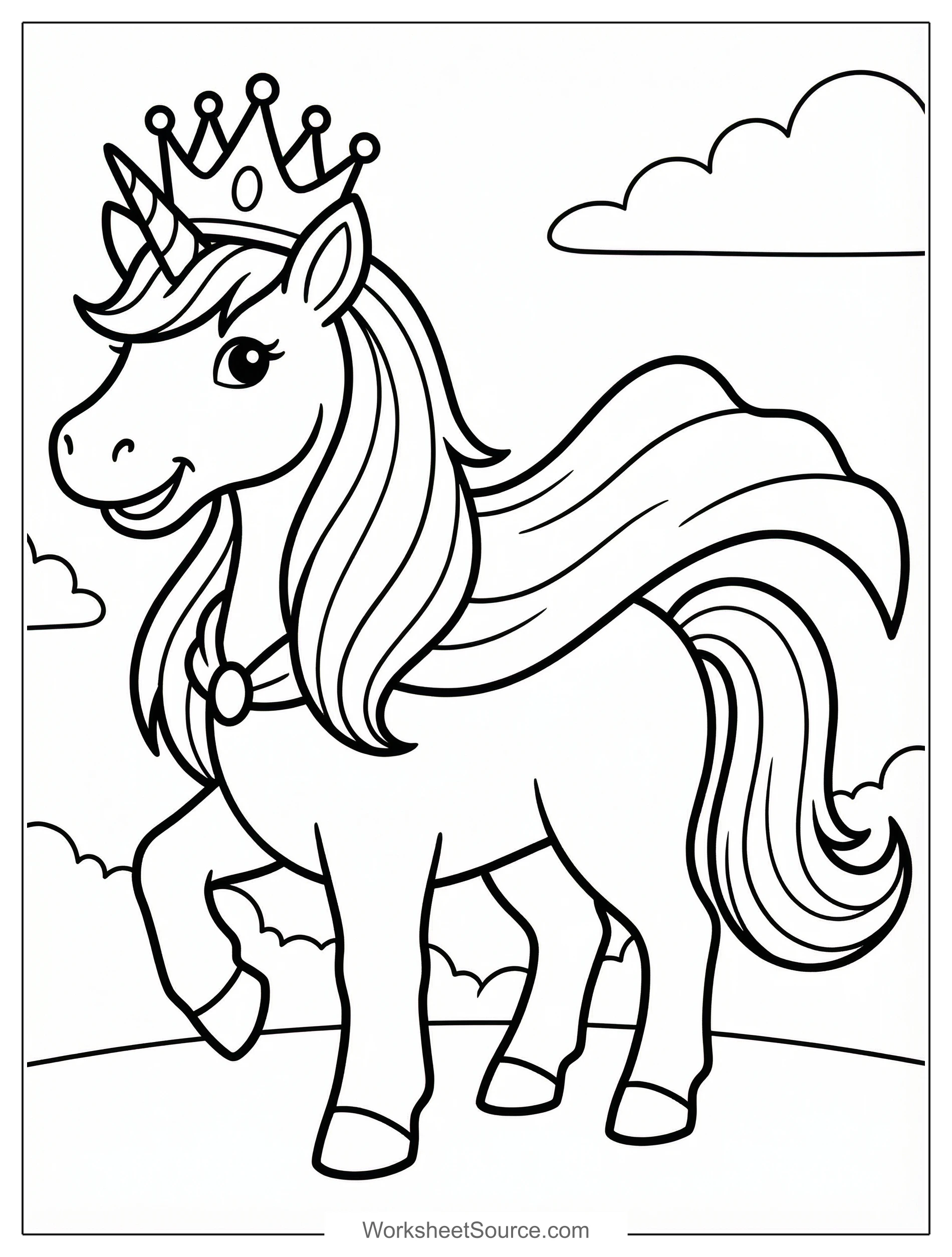Coloring a Royal Unicorn With Cape coloring page is a joyful way to spark imagination and create a little story as you color. Picture the unicorn trotting through a sparkling meadow, and use bright colors to show personality and mood. This printable invites children to experiment with patterns on the cape, to mix shiny metallic crayons for the crown, and to think about how light hits the mane and tail. In the classroom, try a group project where each child colors a different scene to make a magical mural, and use the pages for a storytelling center where kids write a short tale to match their colors. At home, this is perfect for a rainy afternoon, a quiet cozy activity that can lead to dress up play or a puppet show. For an extension, ask children to design a shield or banner for the unicorn, add a short caption, and display the finished work on a bulletin board or fridge to celebrate creativity.