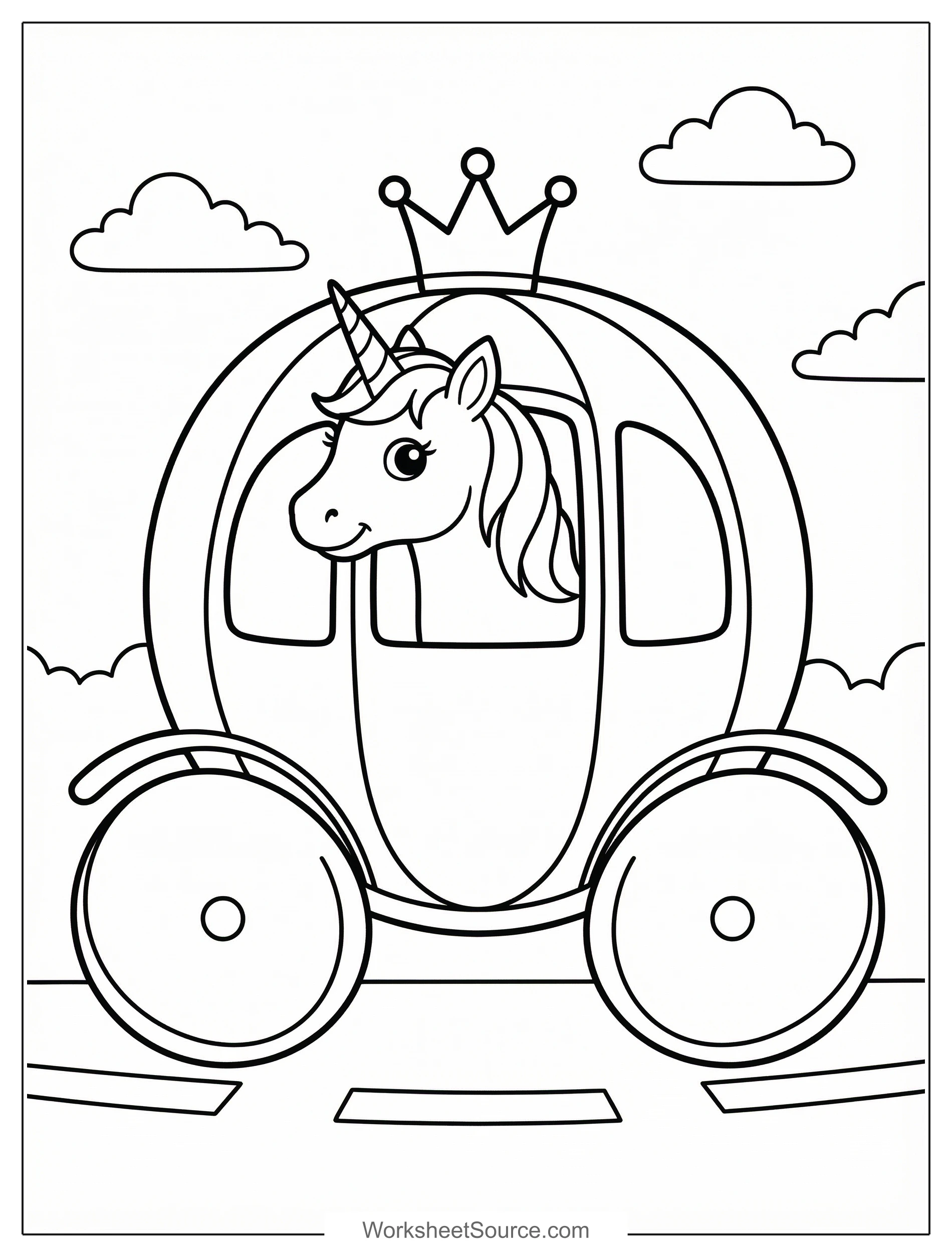 Download this free printable Unicorn in Royal Carriage coloring page for kids. Great for classroom activities, home learning, and creative fun.