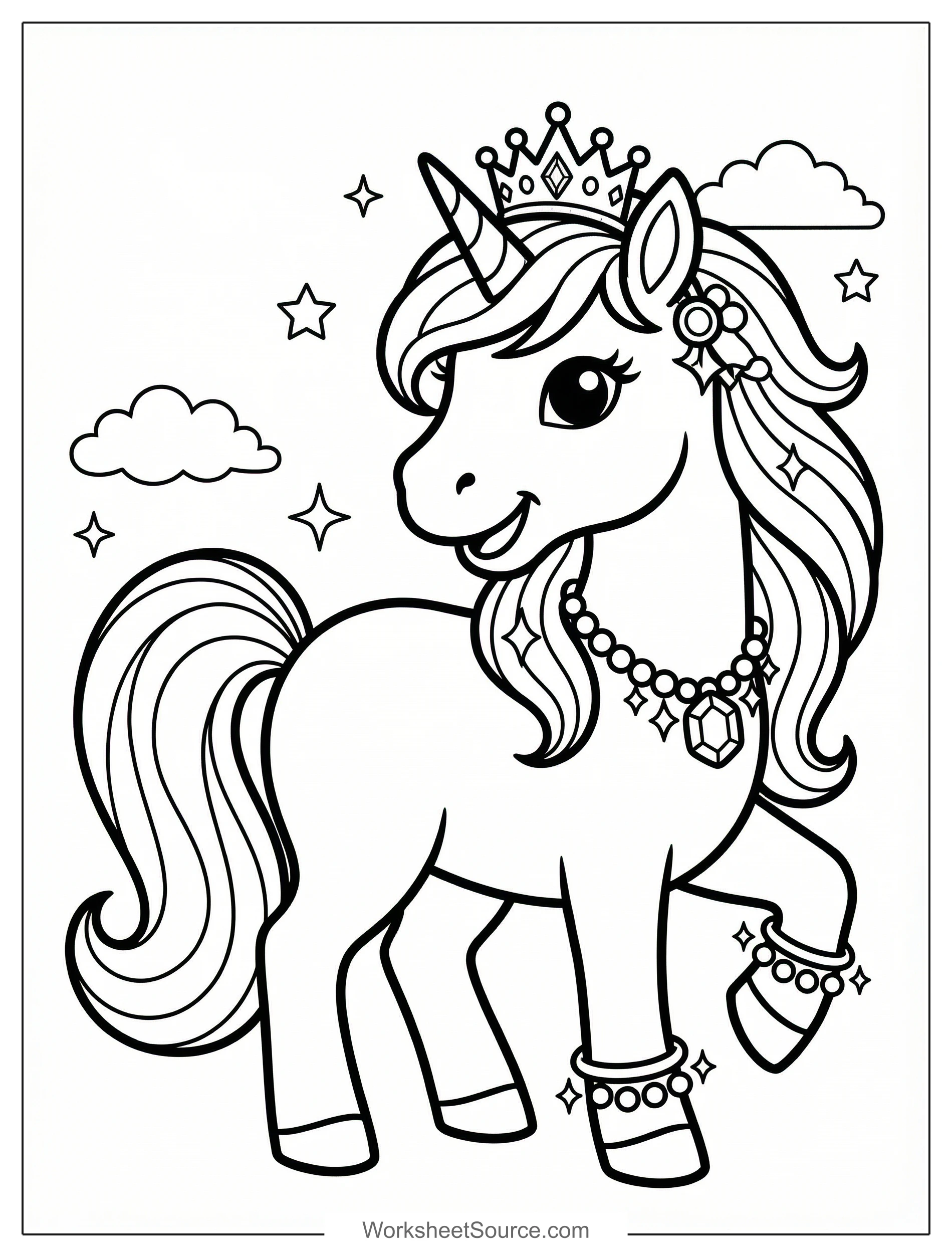 Download this free printable Unicorn With Jewelry coloring page for kids. It is great for classroom activities, home learning, and creative fun.