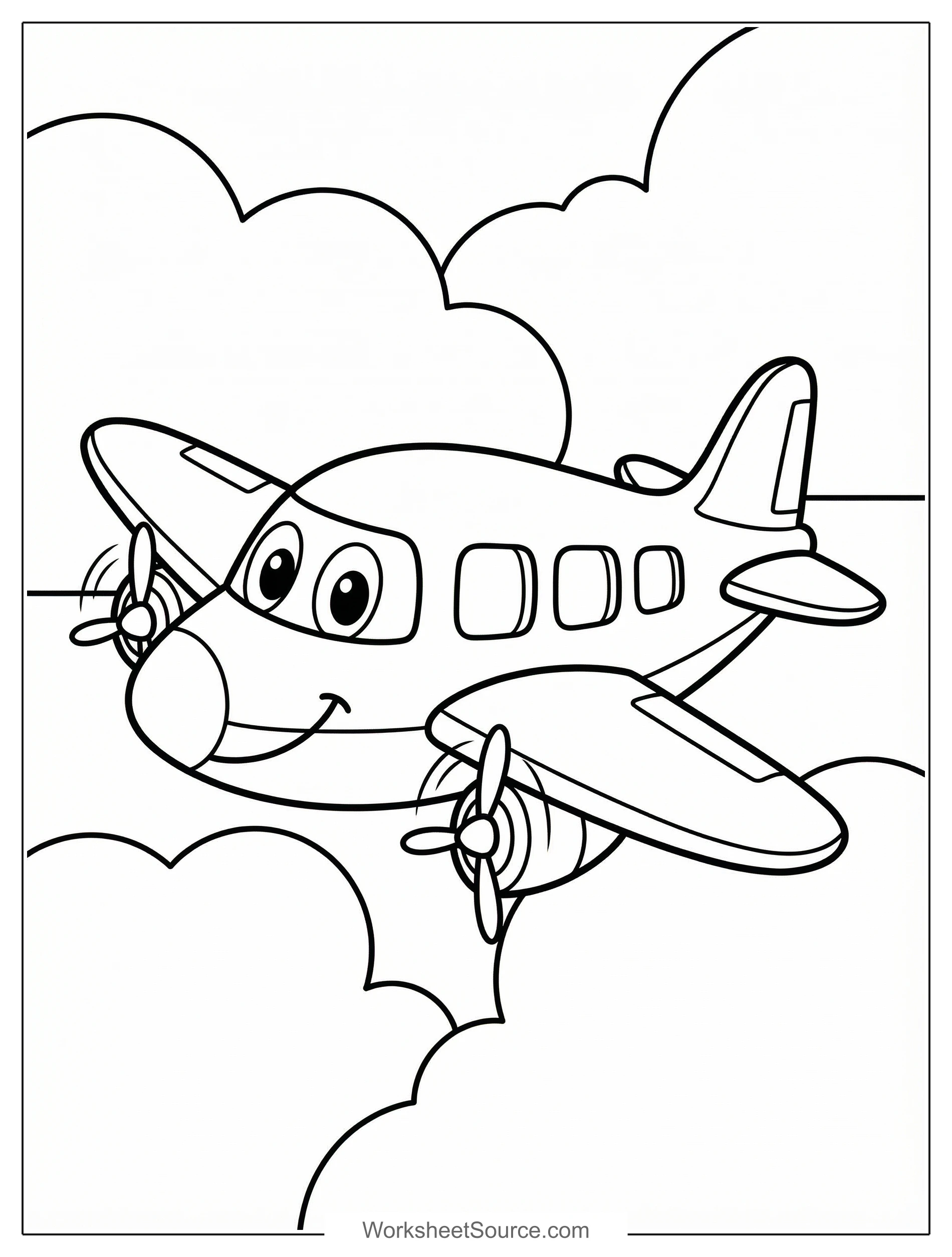 Download this free printable Airplane Flying in Clouds coloring page for kids. Great for classroom activities, home learning, and creative fun.