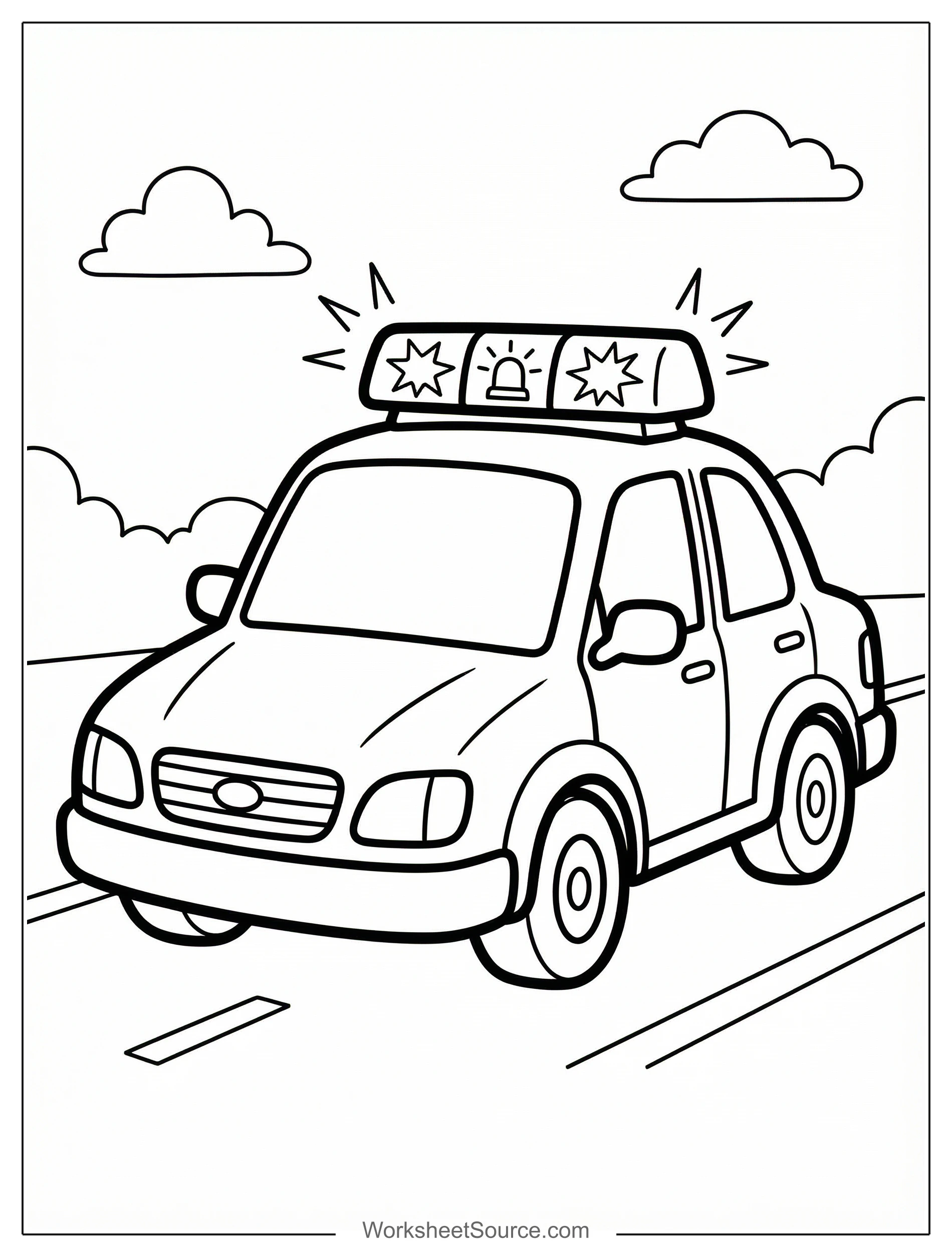 Download this free printable Police Car With Lights coloring page for kids. Great for classroom activities, home learning, and creative fun.