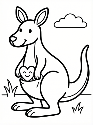 A friendly cartoon kangaroo stands upright, smiling, with a small red heart peeking playfully from its cozy front pouch. The image is line art for coloring.