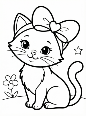 Adorable cartoon cat with a big red heart shaped bow on its head, suitable for coloring. The cat is sitting and facing forward, ready to be colored.